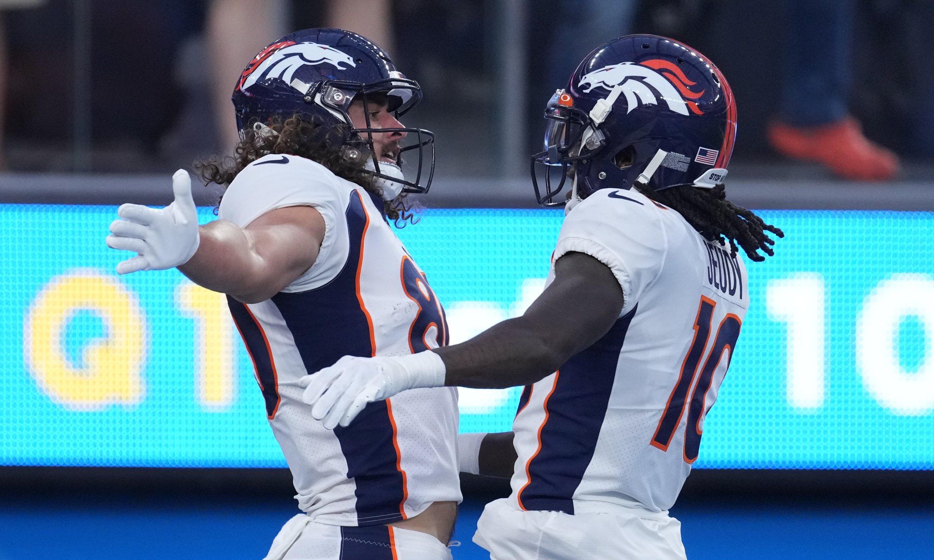 Oct 17, 2022; Inglewood, California, USA; Denver Broncos tight end Greg Dulcich (80) and wide receiver Jerry Jeudy (10) celebrate after a touchdown against the Los Angeles Chargers in the first half at SoFi Stadium. Mandatory Credit: Kirby Lee-USA TODAY Sports