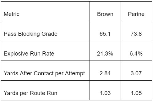 There’s no doubt that Brown’s rushing skillset lags behind his classmates. He split the totes in the Illini backfield until his final season … at age 23. Even then, he wasn’t the most powerful runner. His two-year samples of missed tackles forced per attempt (0.25) and yards after contact per attempt (2.87) sit below the class average. So, Brown’s situation needs to make up for his talent deficit.