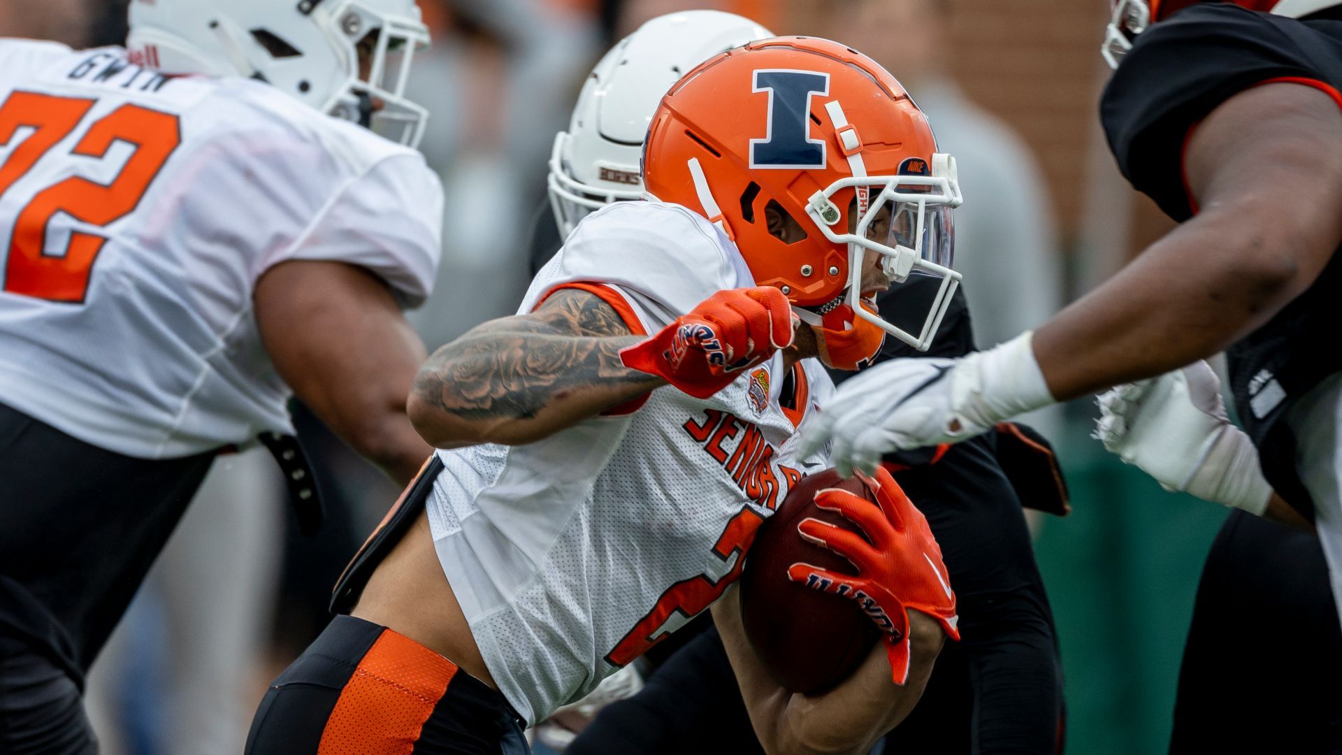 Feb 2, 2023; Mobile, AL, USA; National running back Chase Brown of Illinois (2) runs the ball during the third day of Senior Bowl week at Hancock Whitney Stadium in Mobile. Mandatory Credit: Vasha Hunt-USA TODAY Sports
