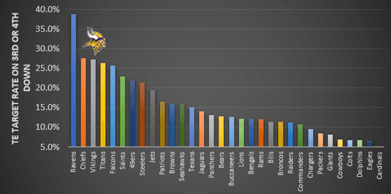 After the trade for T.J. Hockenson, Minnesota soared to third in target rate to the TE position in obvious passing situations and ranked 12th in EPA per play on third- and fourth-down attempts. But, with Kirk’s decision-making, relying on a TE running shallow routes has obvious (read: painful) drawbacks.