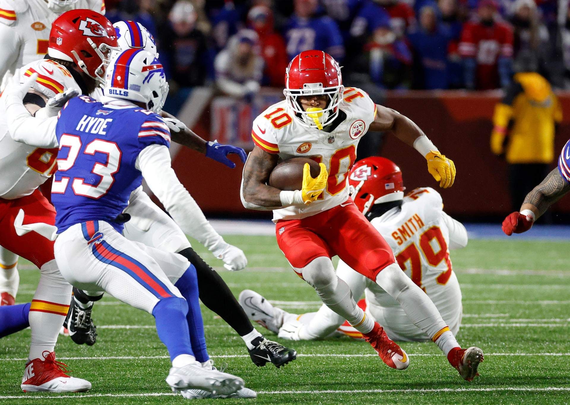 Kansas City Chiefs running back Isiah Pacheco (10) cuts back for a short gain.