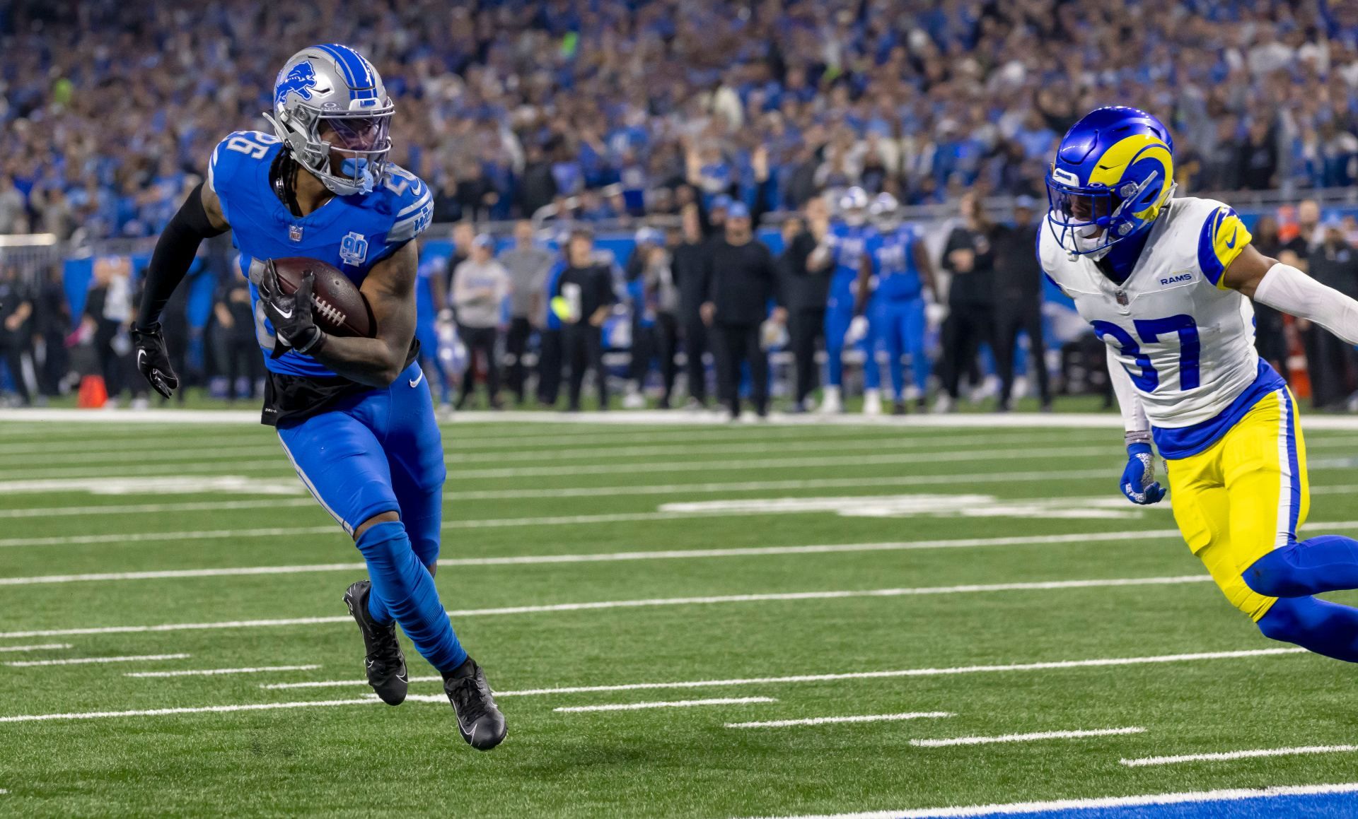 Jan 14, 2024; Detroit, Michigan, USA; Detroit Lions running back Jahmyr Gibbs (26) runs for a touchdown against Los Angeles Rams safety Quentin Lake (37) during the first half of a 2024 NFC wild card game at Ford Field. Mandatory Credit: David Reginek-USA TODAY Sports