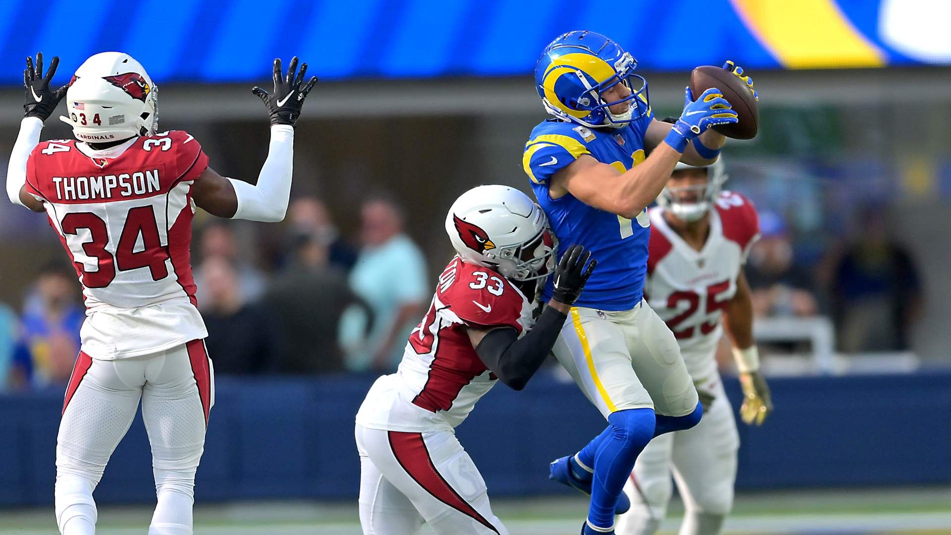 Nov 13, 2022; Inglewood, California, USA; Arizona Cardinals cornerback Antonio Hamilton (33) forces an incomplete pass to Los Angeles Rams wide receiver Cooper Kupp (10) in the first half at SoFi Stadium. Mandatory Credit: Jayne Kamin-Oncea-USA TODAY Sports