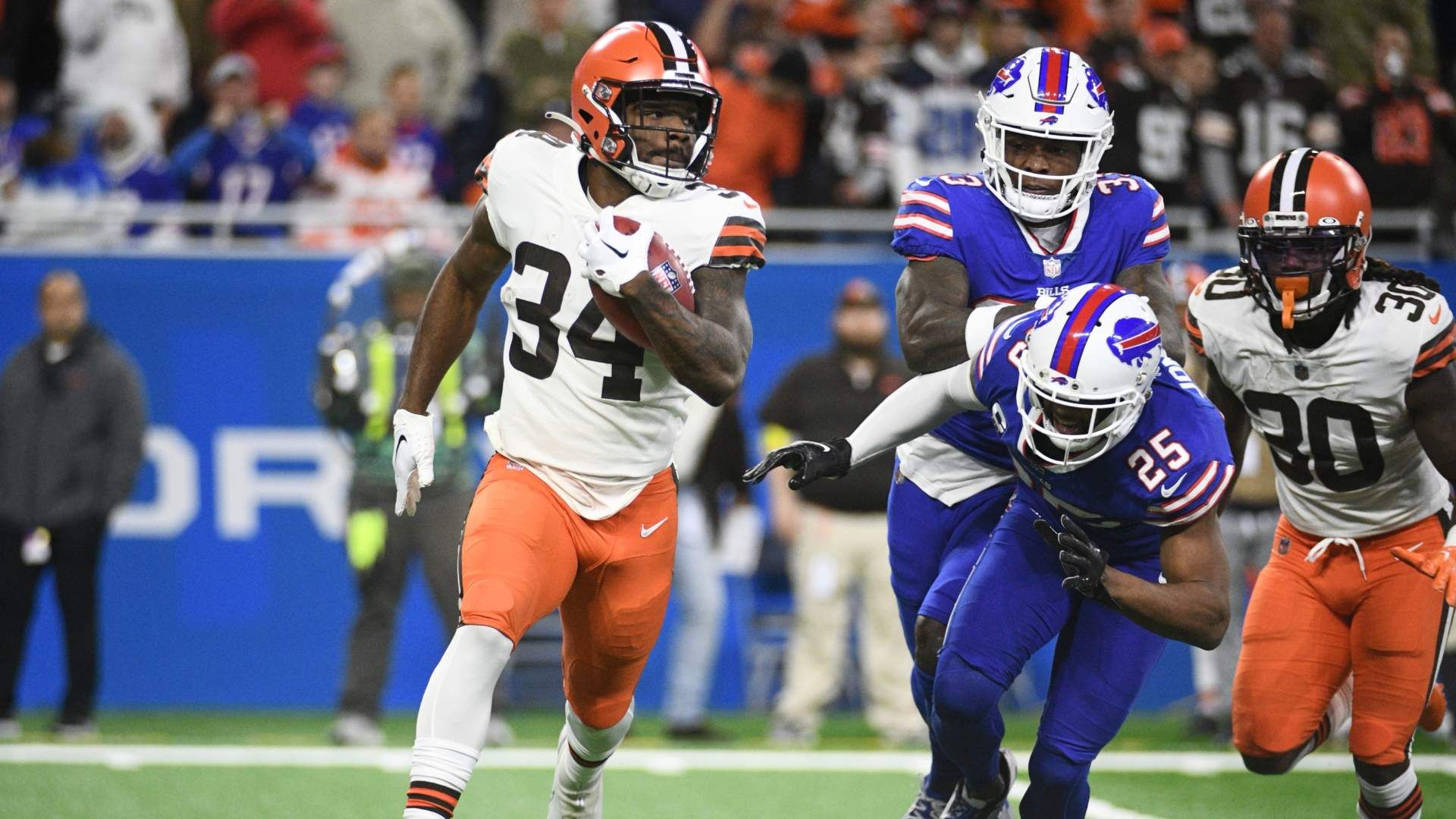 Nov 20, 2022; Detroit, Michigan, USA; Cleveland Browns running back Jerome Ford (34) runs the ball as Buffalo Bills running back Taiwan Jones (25) pursues during the first quarter Ford Field. Mandatory Credit: Tim Fuller-USA TODAY Sports
