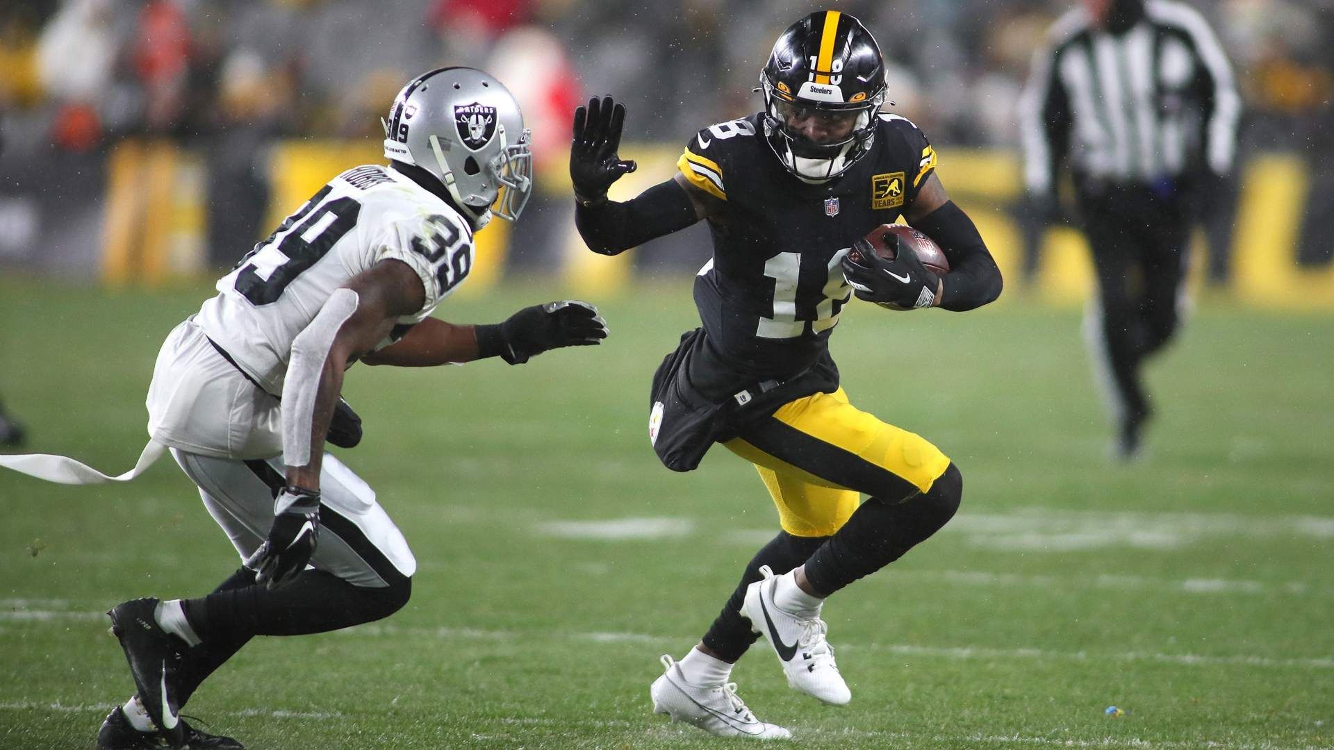 Pittsburgh Steelers Diontae Johnson (18) stiff arms Las Vegas Raiders Nate Hobbs (39) during the first half at Acrisure Stadium in Pittsburgh, PA on December 24, 2022. Pittsburgh Steelers Vs Las Vegas Raiders Week 16 Photo Credit: Michael Longo/For USA Today Network / USA TODAY NETWORK