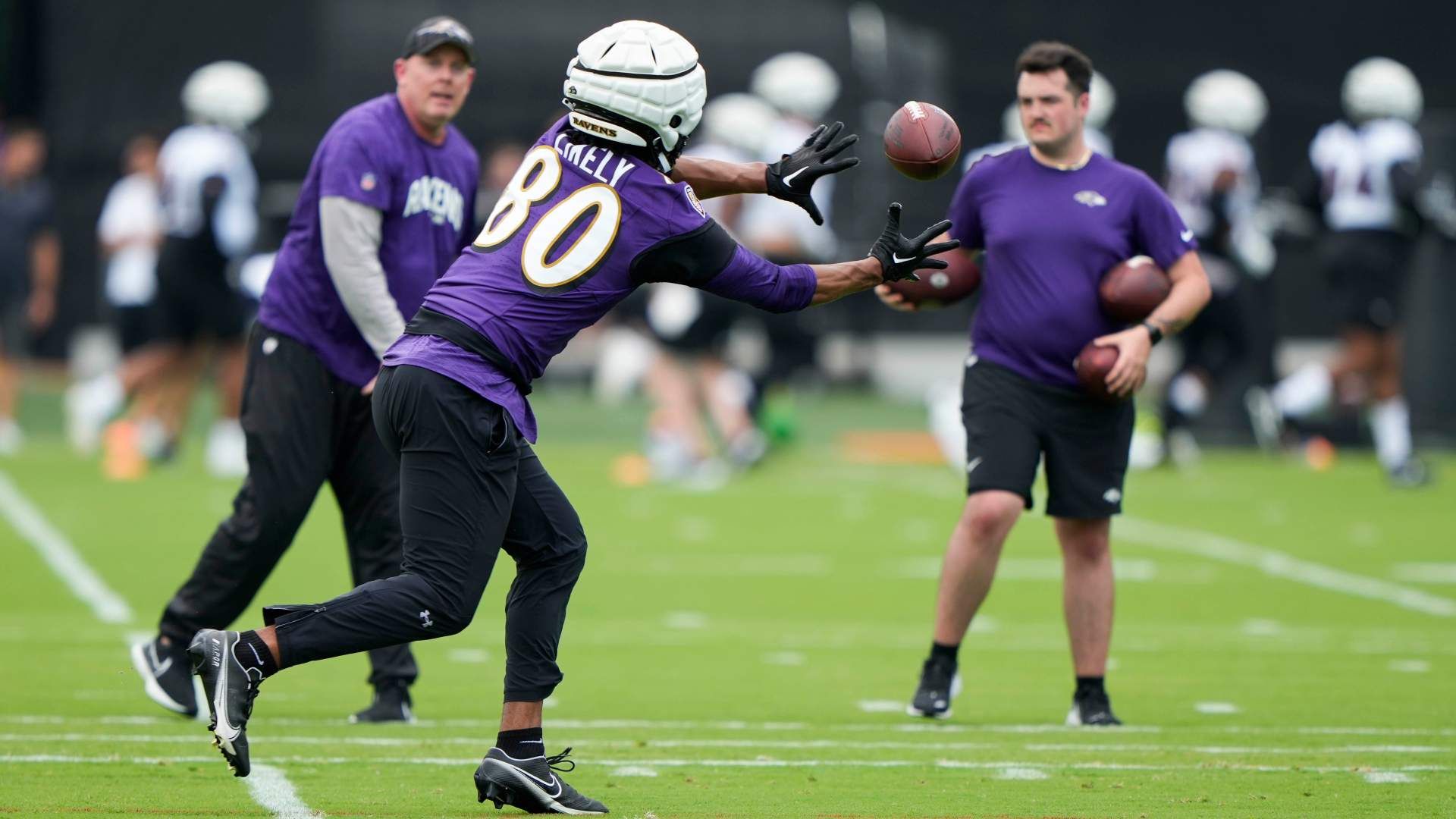 Jul 27, 2023; Owings Mills, MD, USA; Baltimore Ravens tight end Isaiah Likely (80) catches a pass from Baltimore Ravens tight ends coach George Godsey during training camp practice at Under Armour Performance Center. Mandatory Credit: Brent Skeen-USA TODAY Sports