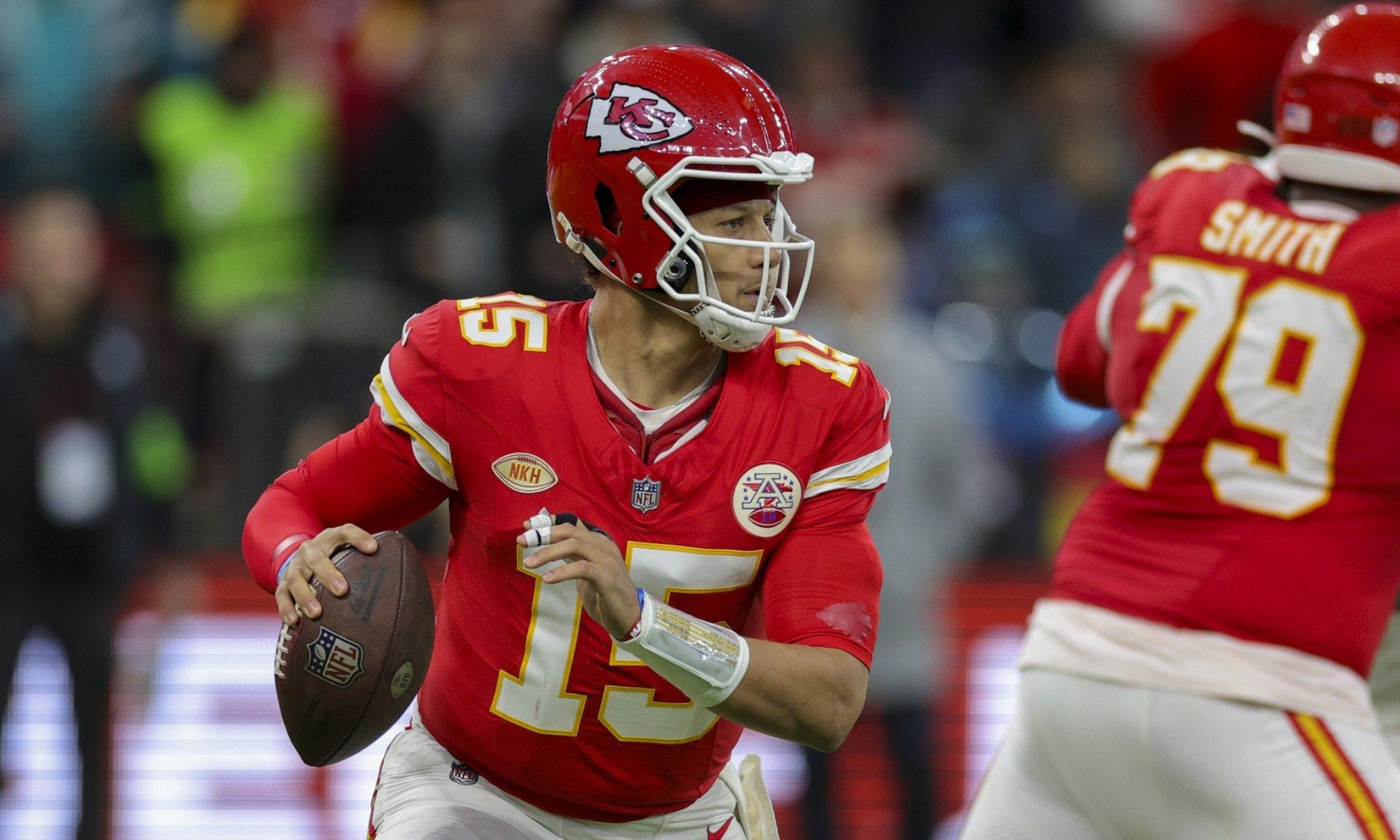 Nov 5, 2023; Frankfurt, Germany, ; Kansas City Chiefs quarterback Patrick Mahomes (15) drops back to pass against the Miami Dolphins in the first quarter during an NFL International Series game at Deutsche Bank Park. Mandatory Credit: Nathan Ray Seebeck-USA TODAY Sports