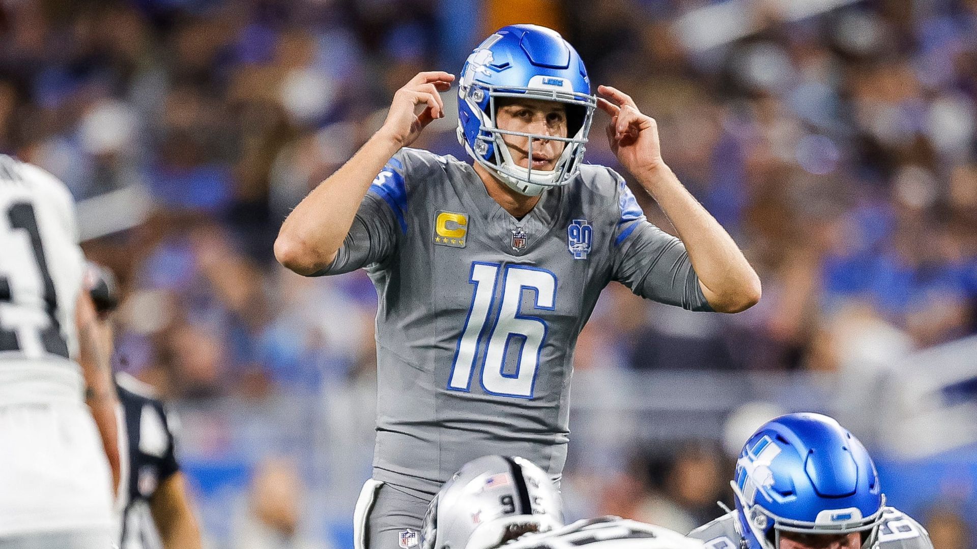 Detroit Lions quarterback Jared Goff talks to teammates at the line of scrimmage before a play against Las Vegas Raiders during the first half at Ford Field in Detroit on Monday, Oct. 30, 2023.