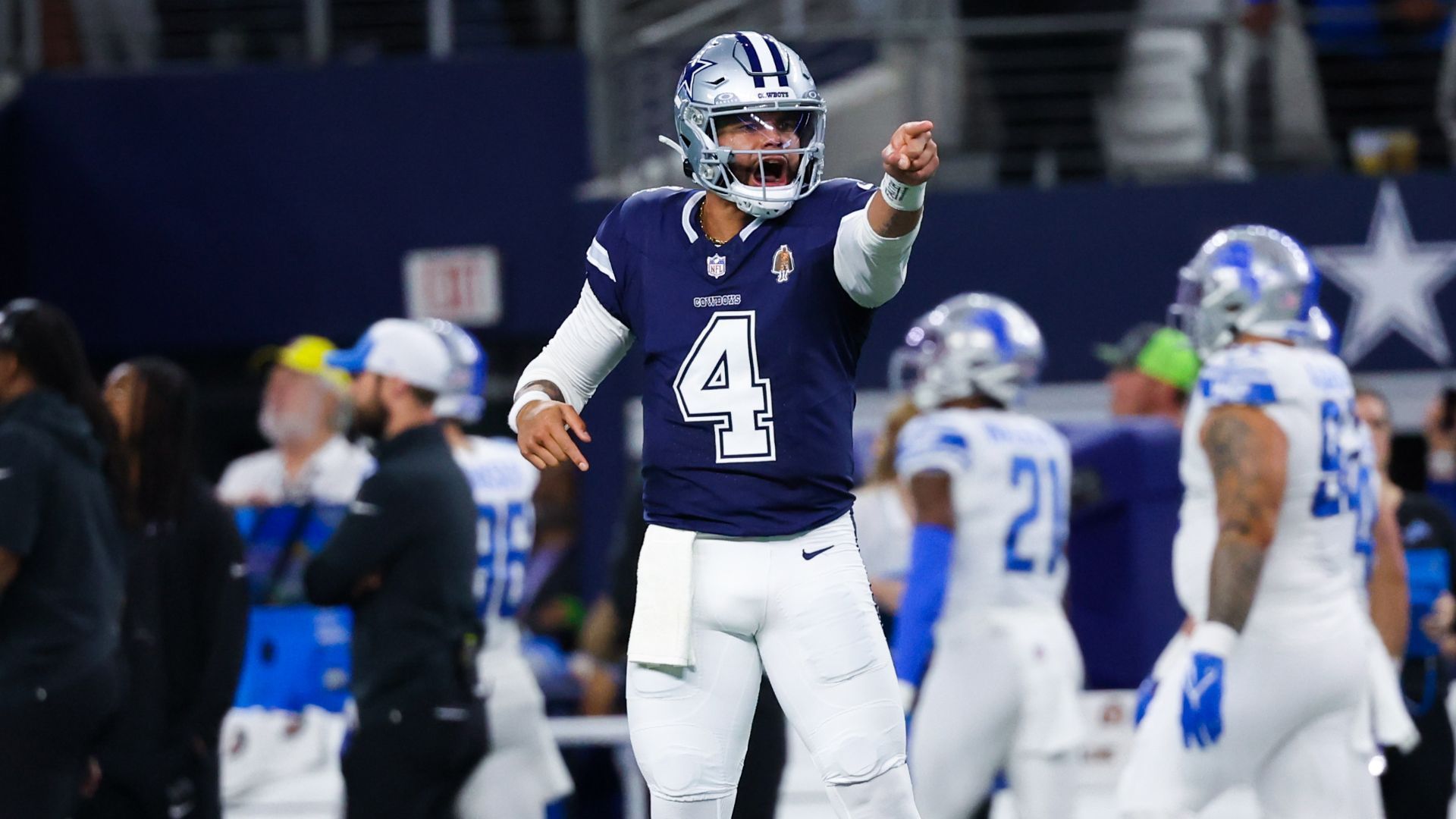 Dec 30, 2023; Arlington, Texas, USA; Dallas Cowboys quarterback Dak Prescott (4) reacts after throwing a touchdown pass during the first half against the Detroit Lions at AT&T Stadium. Mandatory Credit: Kevin Jairaj-USA TODAY Sports