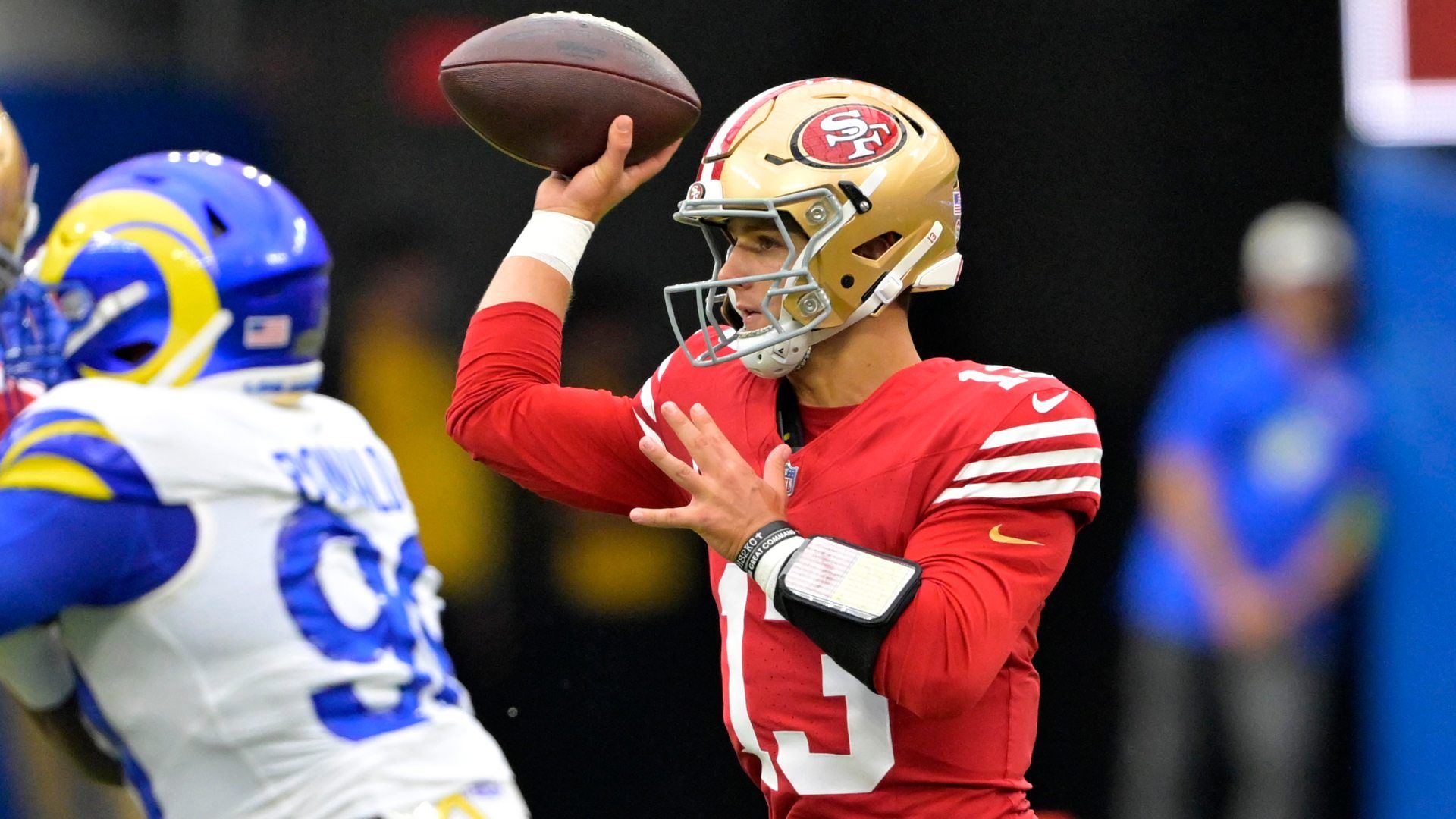 Sep 17, 2023; Inglewood, California, USA; San Francisco 49ers quarterback Brock Purdy (13) throws a pass in the first half against the Los Angeles Rams at SoFi Stadium. Mandatory Credit: Jayne Kamin-Oncea-USA TODAY Sports