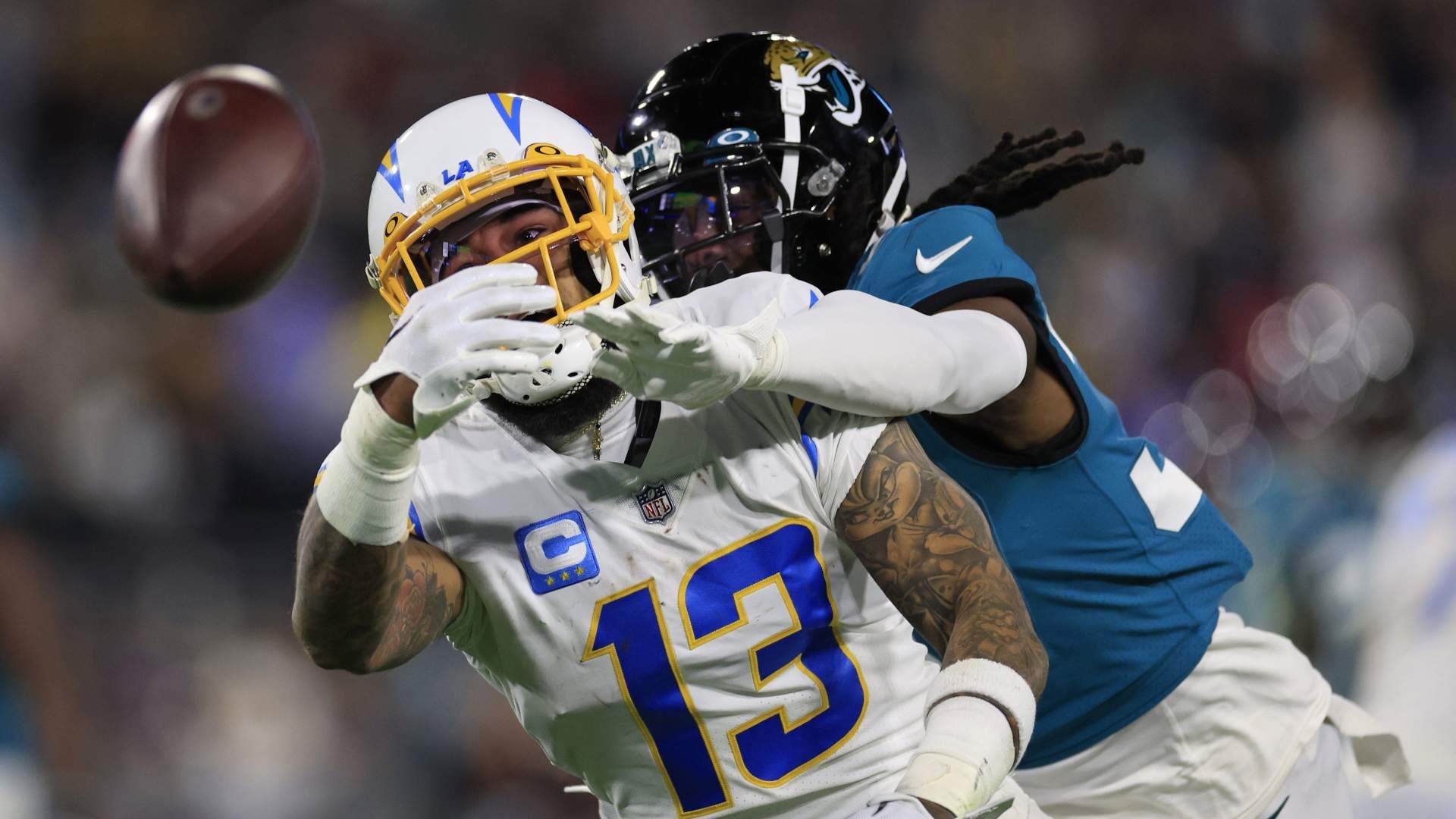 Jacksonville Jaguars cornerback Tre Herndon (37) defends on a pass intended for Los Angeles Chargers wide receiver Keenan Allen (13) during the fourth quarter of an NFL first round playoff football matchup Saturday, Jan. 14, 2023 at TIAA Bank Field in Jacksonville, Fla. An offensive penalty was called against the Los Angeles Chargers on the play. Jacksonville Jaguars edged the Los Angeles Chargers on a field goal 31-30. [Corey Perrine/Florida Times-Union] Jki 011423 Chargers Jags C 59