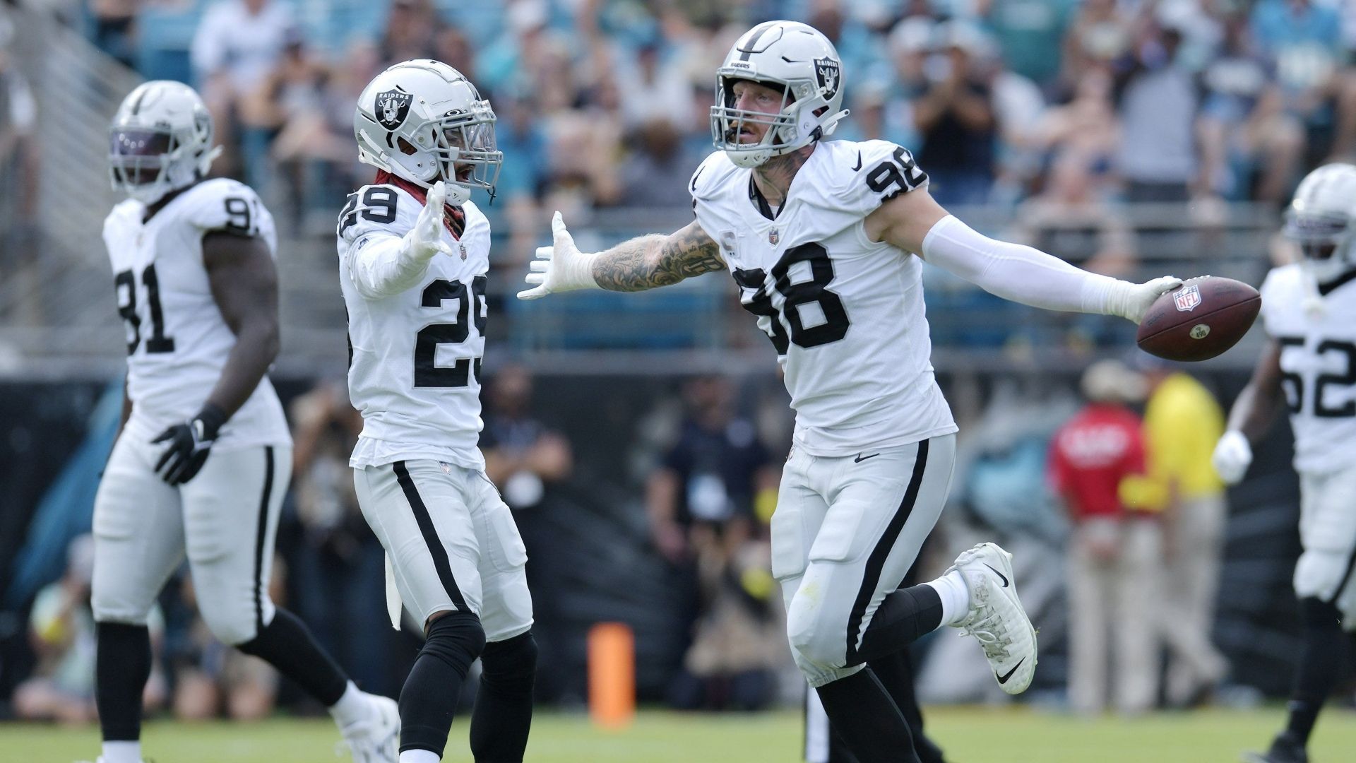Las Vegas Raiders defensive end Maxx Crosby (98) runs to the sidelines after picking up a fumbled ball from Jacksonville Jaguars running back JaMycal Hasty (22) during early first quarter action. The Jacksonville Jaguars hosted the Las Vegas Raiders at TIAA Bank Field in Jacksonville, FL Sunday November 6, 2022. The Jaguars trailed 20 to 10 at the end of the first half. [Bob Self/Florida Times-Union] Jki 110622 Bs Jaguars Vs R 37