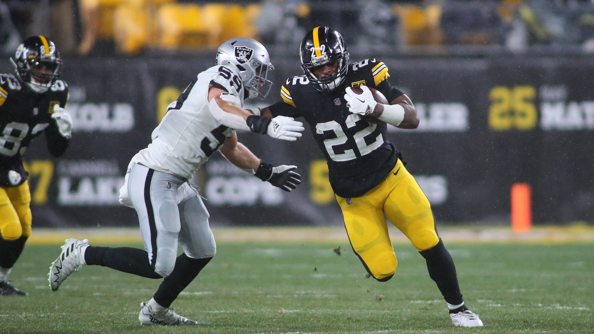 Pittsburgh Steelers Najee Harris (22) stiff arms Las Vegas Raiders Luke Masterson (59) during the first half at Acrisure Stadium in Pittsburgh, PA on December 24, 2022. Pittsburgh Steelers Vs Las Vegas Raiders Week 16