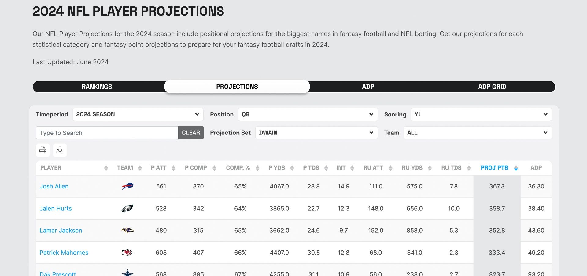 Simply select your league scoring format, input up to four players and immediately receive an easy-to-read chart that tells you everything you need to know. Looking for the player projected to score the most points? The point projection is listed first. Curious to see who is projected to receive more rushing attempts, targets or attempt more passes? You can easily compare players across different positions to help answer those tricky flex or superflex lineup decisions.