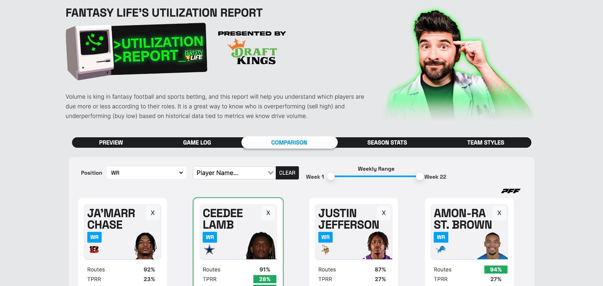 The weekly article highlights data from the corresponding tool. The Game Log feature helps you understand how often a player is on the field, what type of rush or target share they are getting and how many air yards they’re seeing, just to name a few valuable metrics. Much like the Start/Sit tool, you can input up to four players to see how their stats compare.