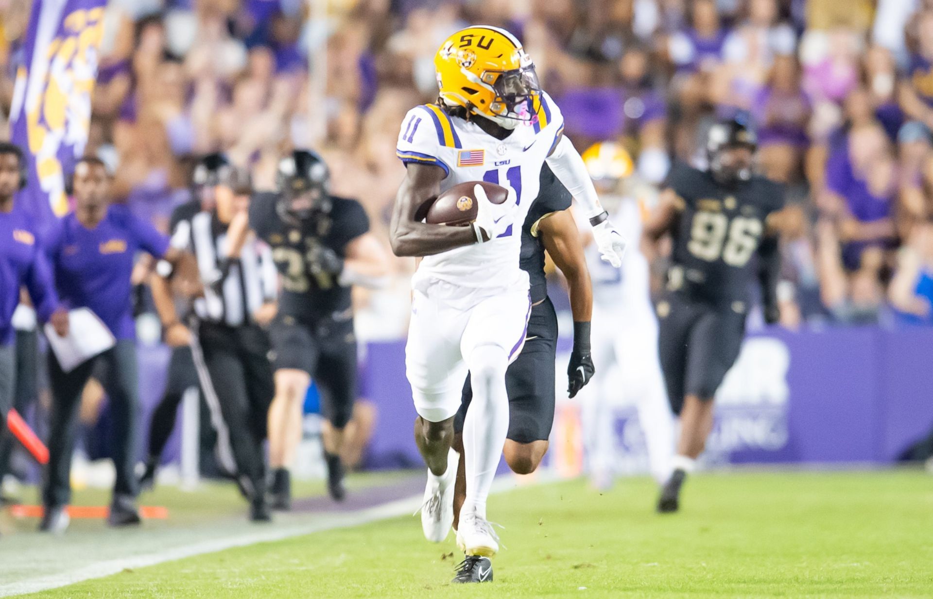 BrIan Thomas Jr (11) pick six and scores a touchdown as the LSU Tigers take on the the Army Black Knights in Tiger Stadium in Baton Rouge, Louisiana, October. 21, 2023.