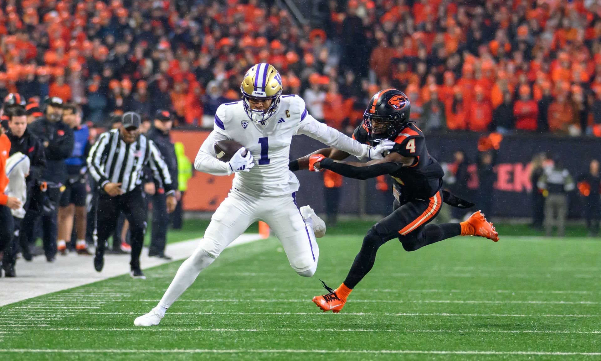 Nov 18, 2023; Corvallis, Oregon, USA; Washington Huskies wide receiver Rome Odunze (1) runs the ball after a catch during the first quarter against the Oregon State Beavers at Reser Stadium. Mandatory Credit: Craig Strobeck-USA TODAY Sports