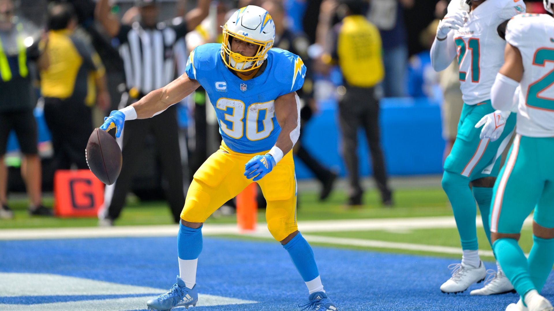 Sep 10, 2023; Inglewood, California, USA; Los Angeles Chargers running back Austin Ekeler (30) celebrates after a touchdown in the first half against the Miami Dolphins at SoFi Stadium. Mandatory Credit: Jayne Kamin-Oncea-USA TODAY Sports