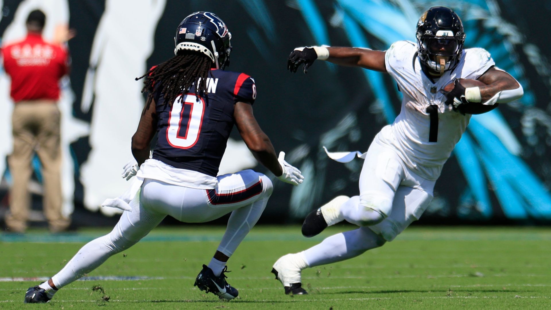 Jacksonville Jaguars running back Travis Etienne Jr. (1) rushes for yards against Houston Texans cornerback Shaquill Griffin (0) during the second quarter of an NFL football matchup Sunday, Sept. 24, 2023 at EverBank Stadium in Jacksonville, Fla. The Houston Texans defeated the Jacksonville Jaguars 37-17. [Corey Perrine/Florida Times-Union]
