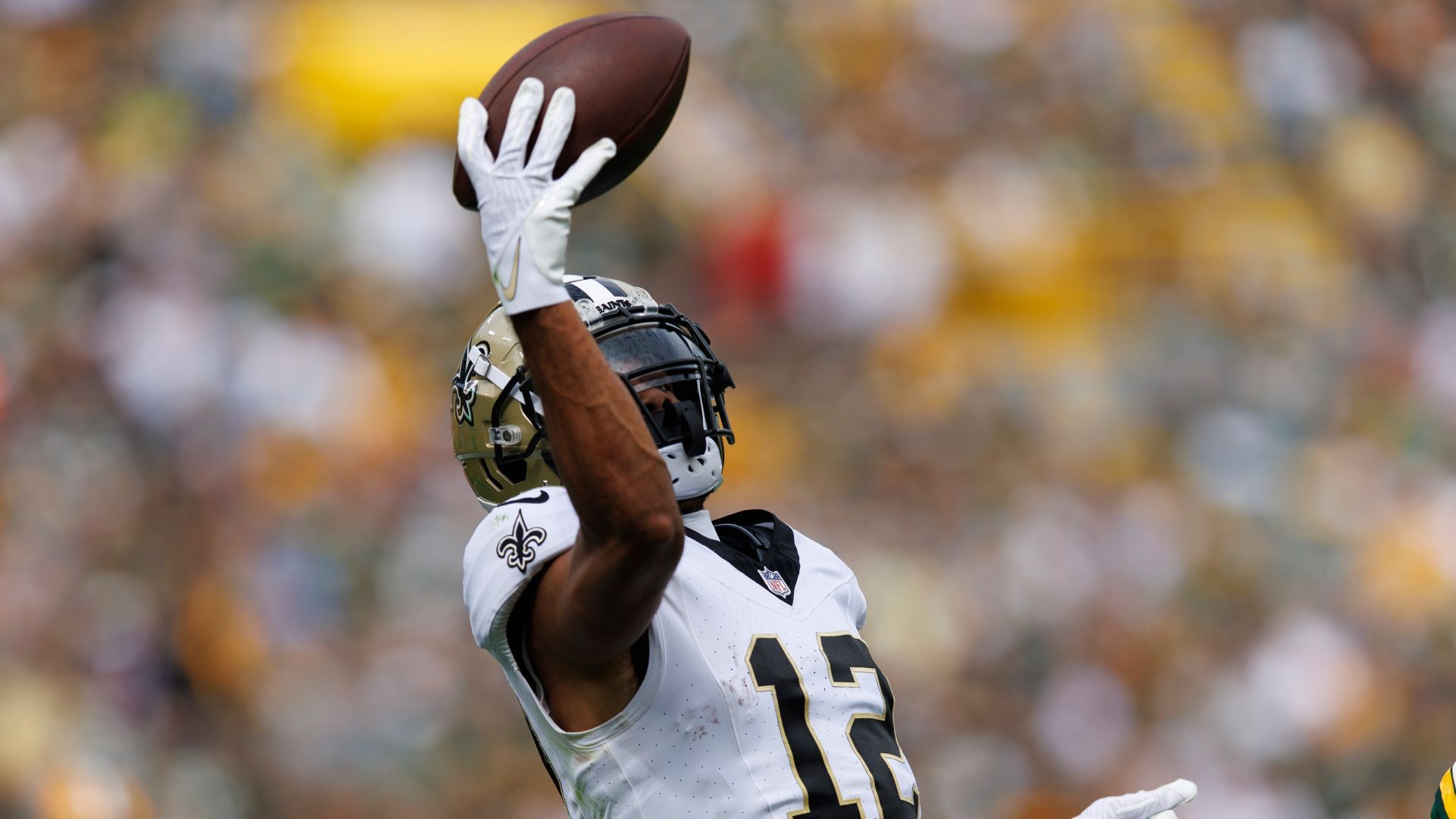 Sep 24, 2023; Green Bay, Wisconsin, USA; New Orleans Saints wide receiver Chris Olave (12) reaches to catch a pass during the second quarter against the Green Bay Packers at Lambeau Field. Mandatory Credit: Jeff Hanisch-USA TODAY Sports