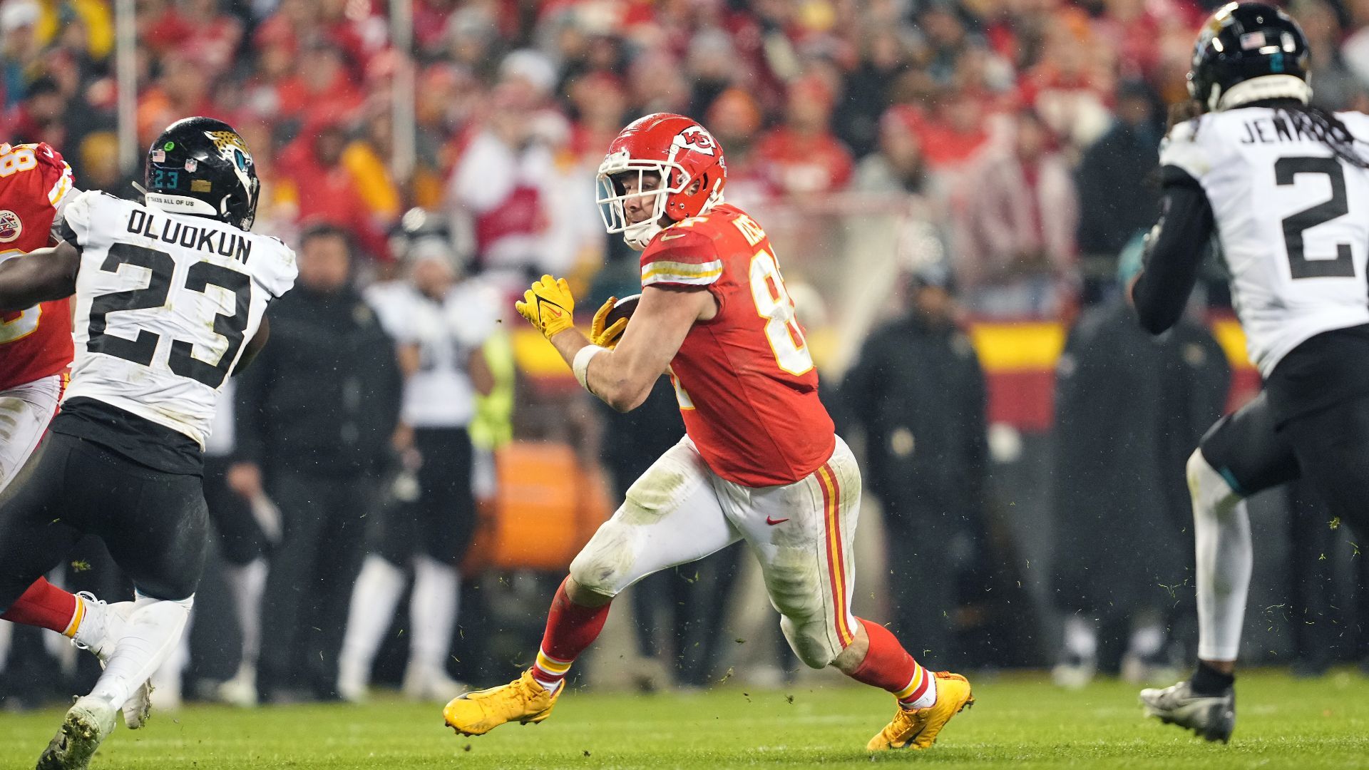 Jan 21, 2023; Kansas City, Missouri, USA; Kansas City Chiefs tight end Travis Kelce (87) runs the ball against Jacksonville Jaguars linebacker Foyesade Oluokun (23) and safety Rayshawn Jenkins (2) during the second half in the AFC divisional round game at GEHA Field at Arrowhead Stadium. Mandatory Credit: Jay Biggerstaff-USA TODAY Sports