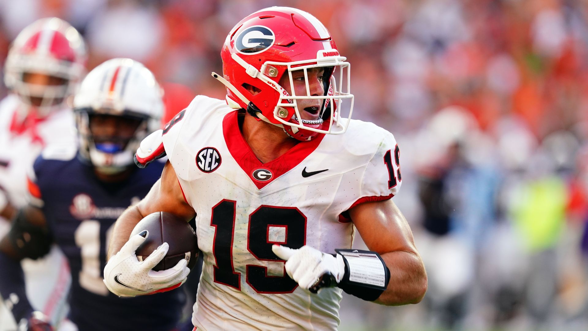 Sep 30, 2023; Auburn, Alabama, USA; Georgia Bulldogs tight end Brock Bowers (19) carries a touchdown reception against the Auburn Tigers during the fourth quarter at Jordan-Hare Stadium. Mandatory Credit: John David Mercer-USA TODAY Sports