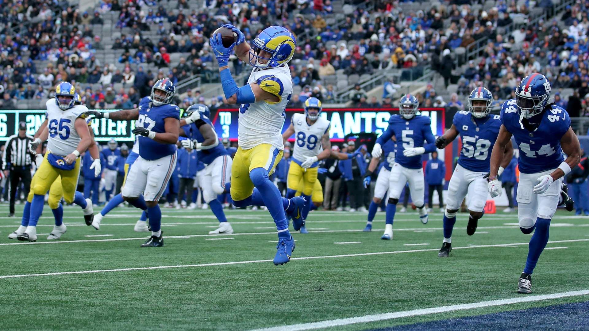 Dec 31, 2023; East Rutherford, New Jersey, USA; Los Angeles Rams wide receiver Cooper Kupp (10) catches a touchdown pass against New York Giants cornerback Nick McCloud (44) during the second quarter at MetLife Stadium. Mandatory Credit: Brad Penner-USA TODAY Sports