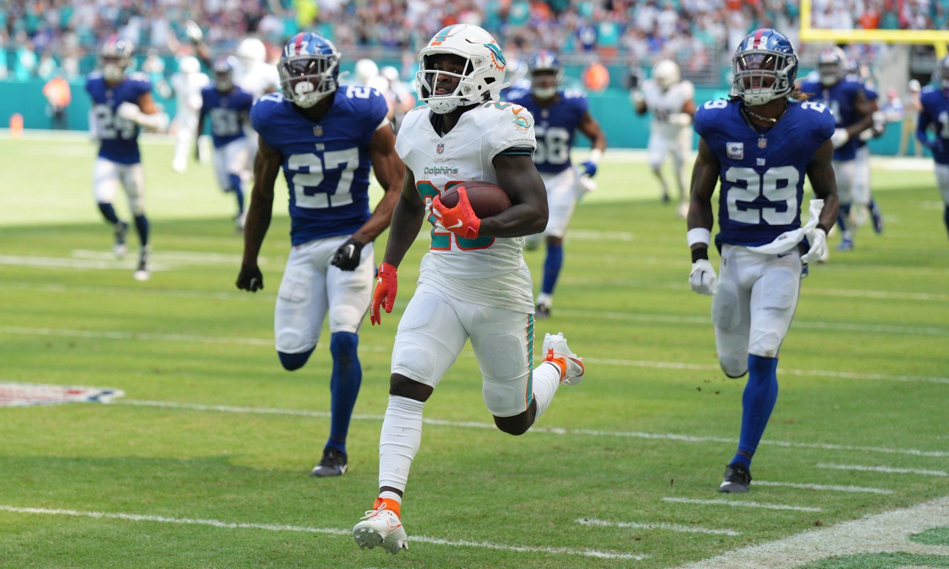 Miami Dolphins running back De'Von Achane (28) breaks free for a 76-yard touchdown run against the New York Giants during the first half of an NFL game at Hard Rock Stadium in Miami Gardens, October 8, 2023.