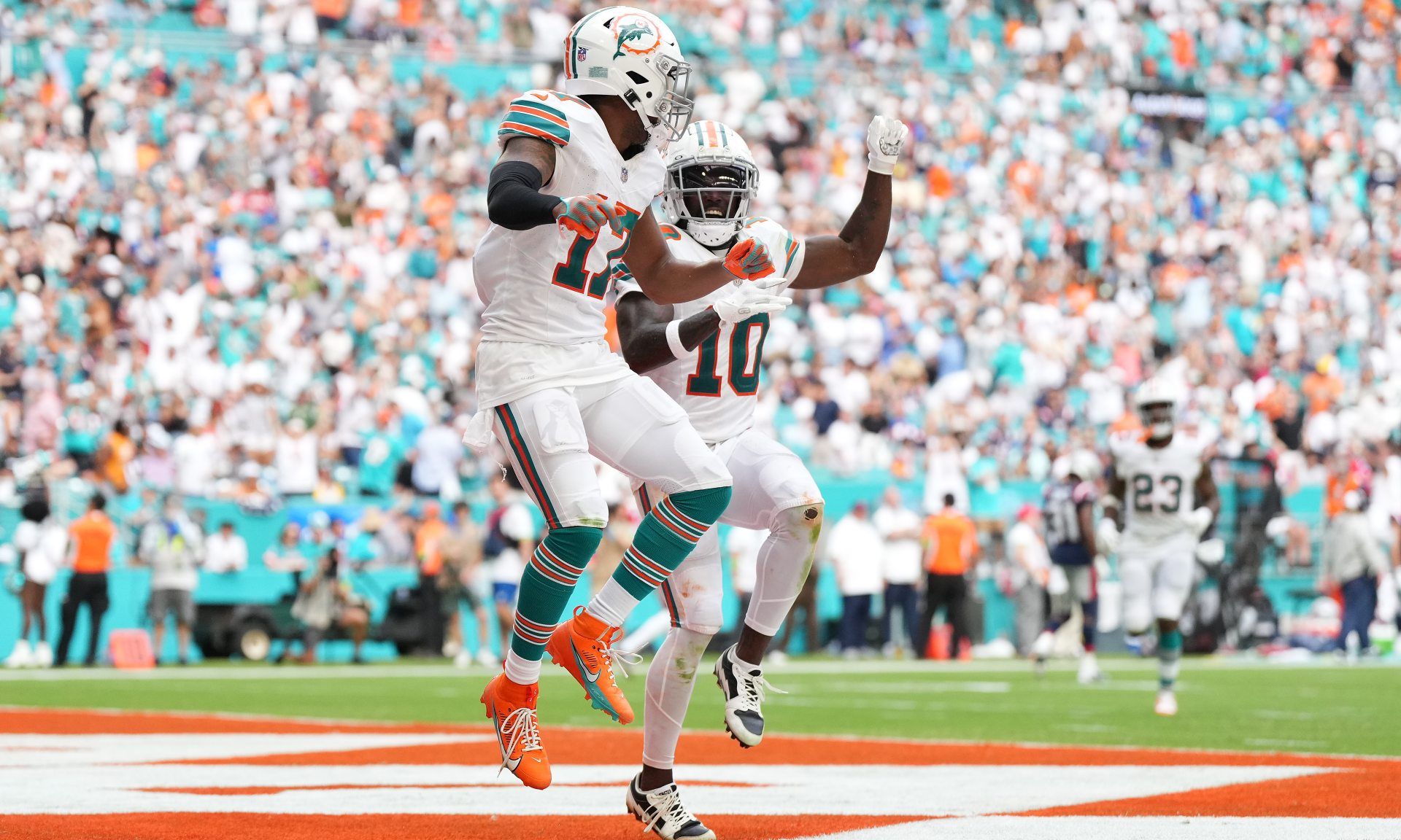 Oct 29, 2023; Miami Gardens, Florida, USA; Miami Dolphins wide receiver Jaylen Waddle (17) celebrates his touchdown against the New England Patriots with wide receiver Tyreek Hill (10) during the second half at Hard Rock Stadium. Mandatory Credit: Jasen Vinlove-USA TODAY Sports