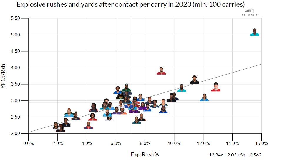 Achane's rookie-year efficiency essentially broke RB performance charts. The man skews everything thanks to his regular placement DEEP in the upper right quadrant.