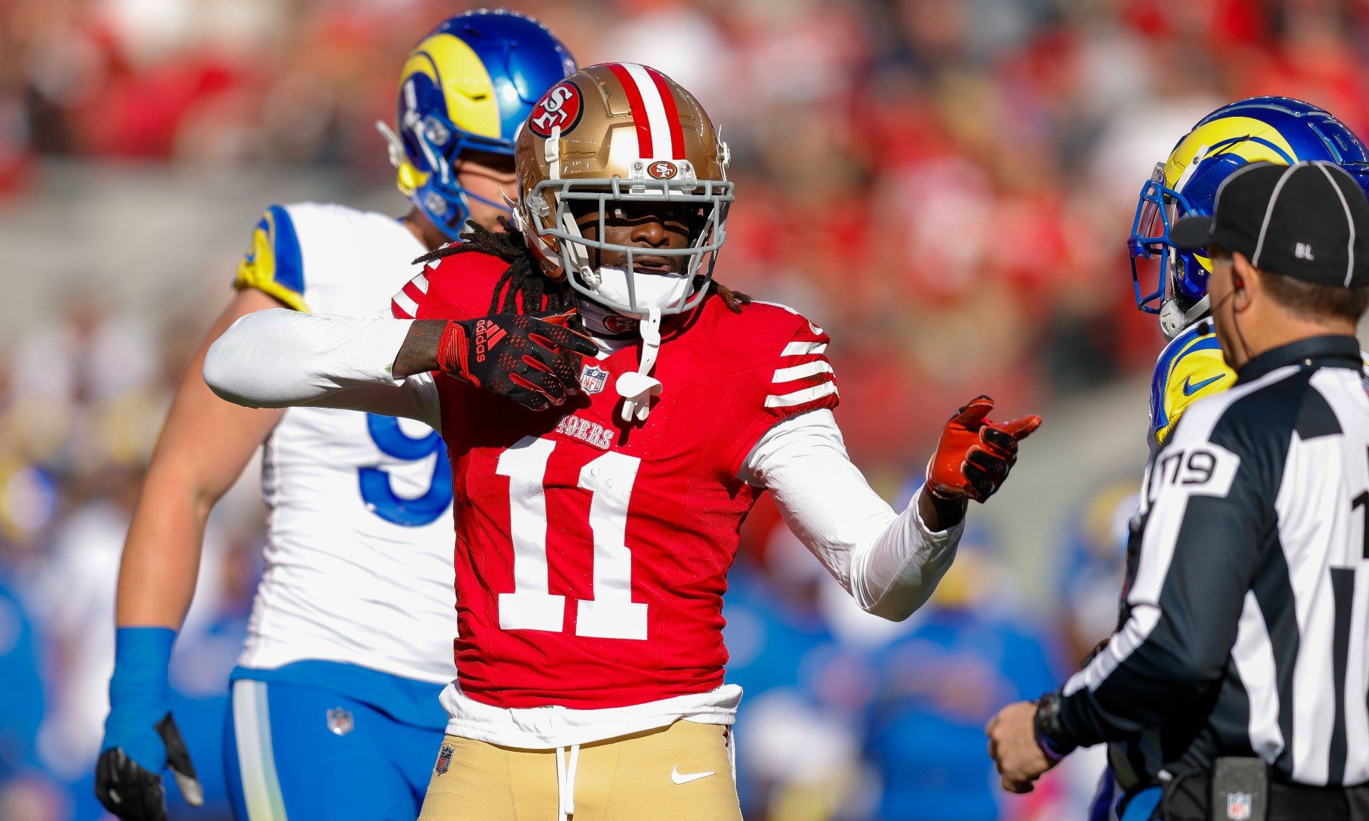 Jan 7, 2024; Santa Clara, California, USA; San Francisco 49ers wide receiver Brandon Aiyuk (11) celebrates after a play against the Los Angeles Rams during the first quarter at Levi's Stadium. Mandatory Credit: Sergio Estrada-USA TODAY Sports