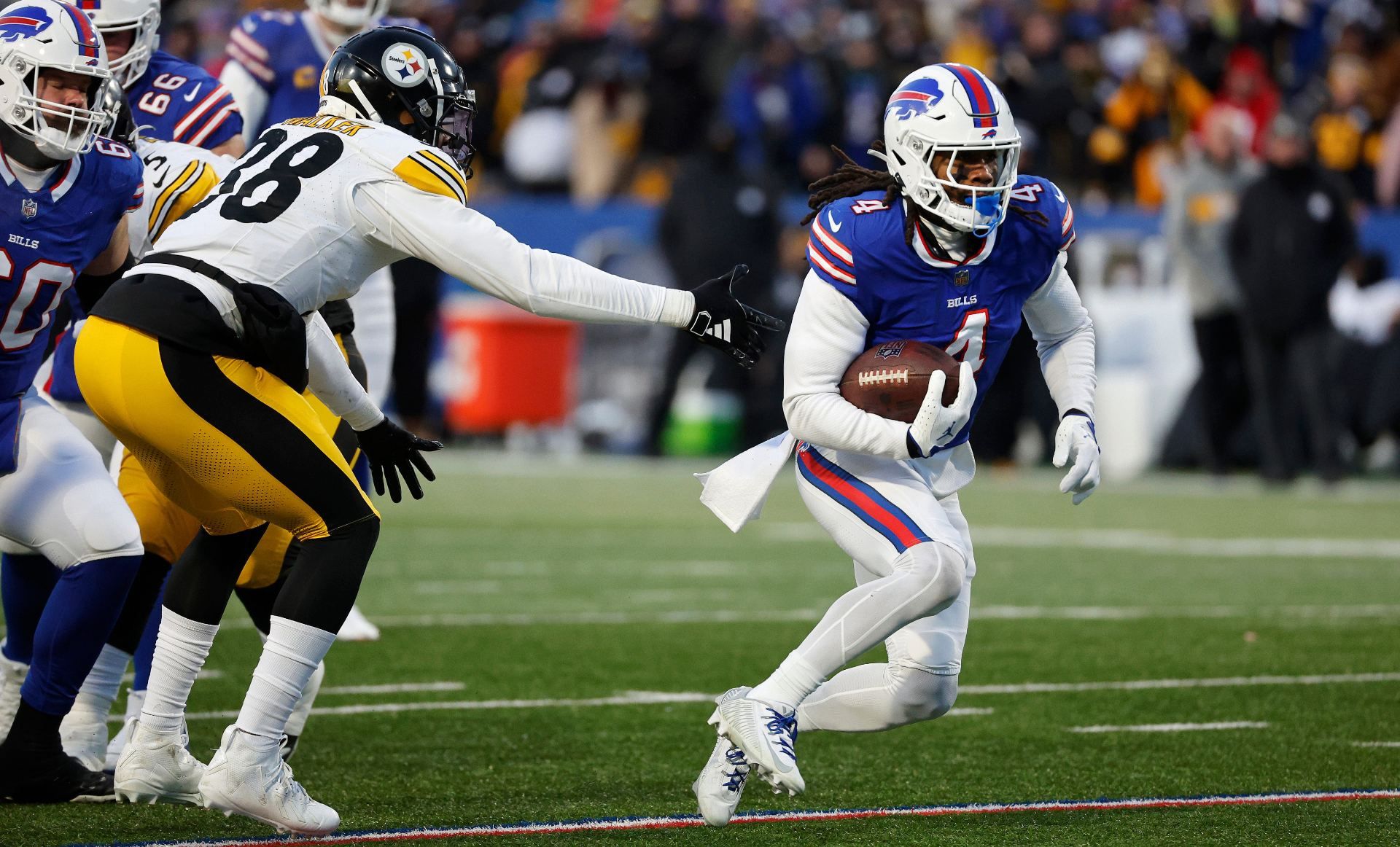 Buffalo Bills running back James Cook (4) finds room to run against the Steelers.