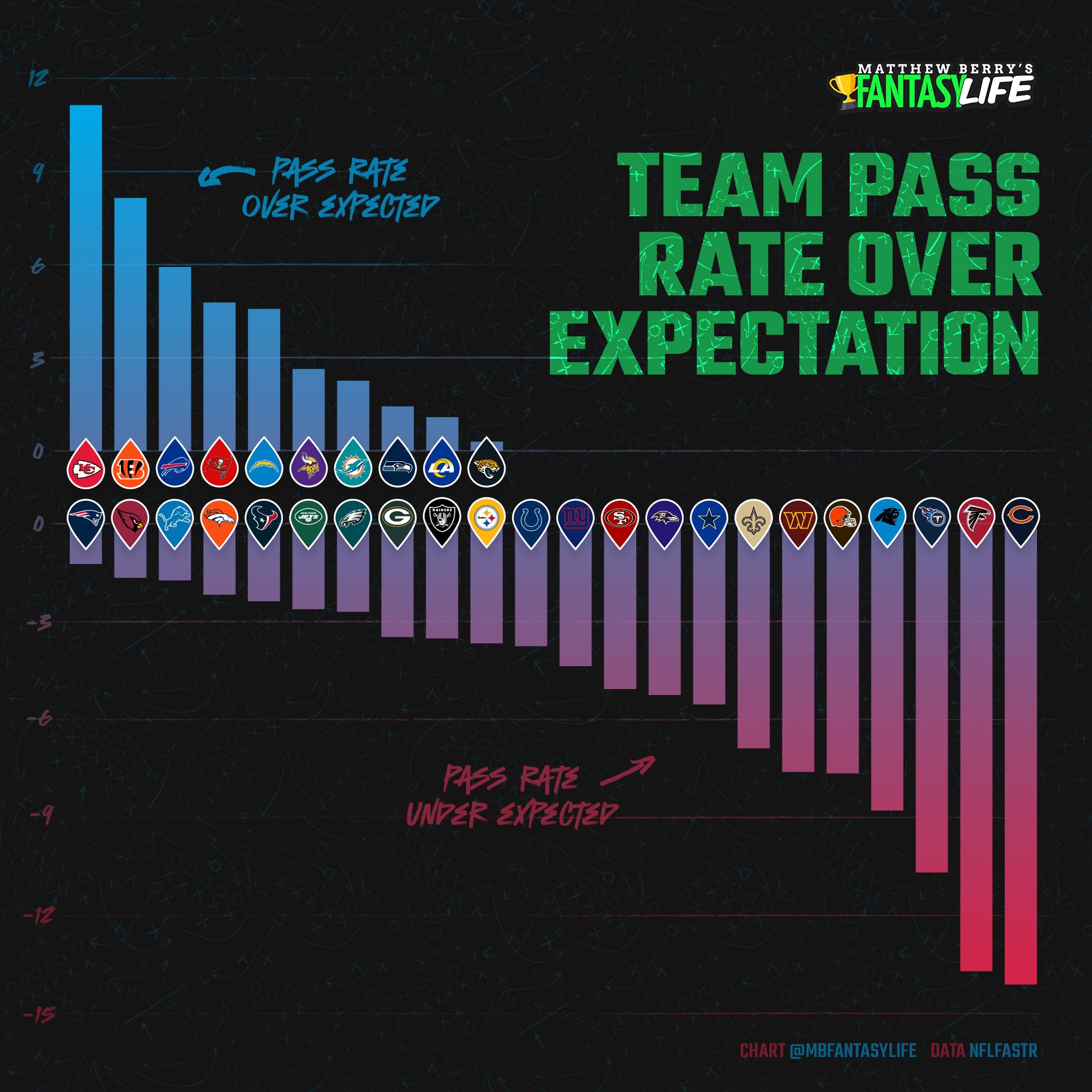 He joins a team that LOVED to run the football last season. They ranked 31st in pass rate over expectation (PROE), leading only the Justin Fields-led Bears. In the red zone, no team had a lower PROE than Atlanta.