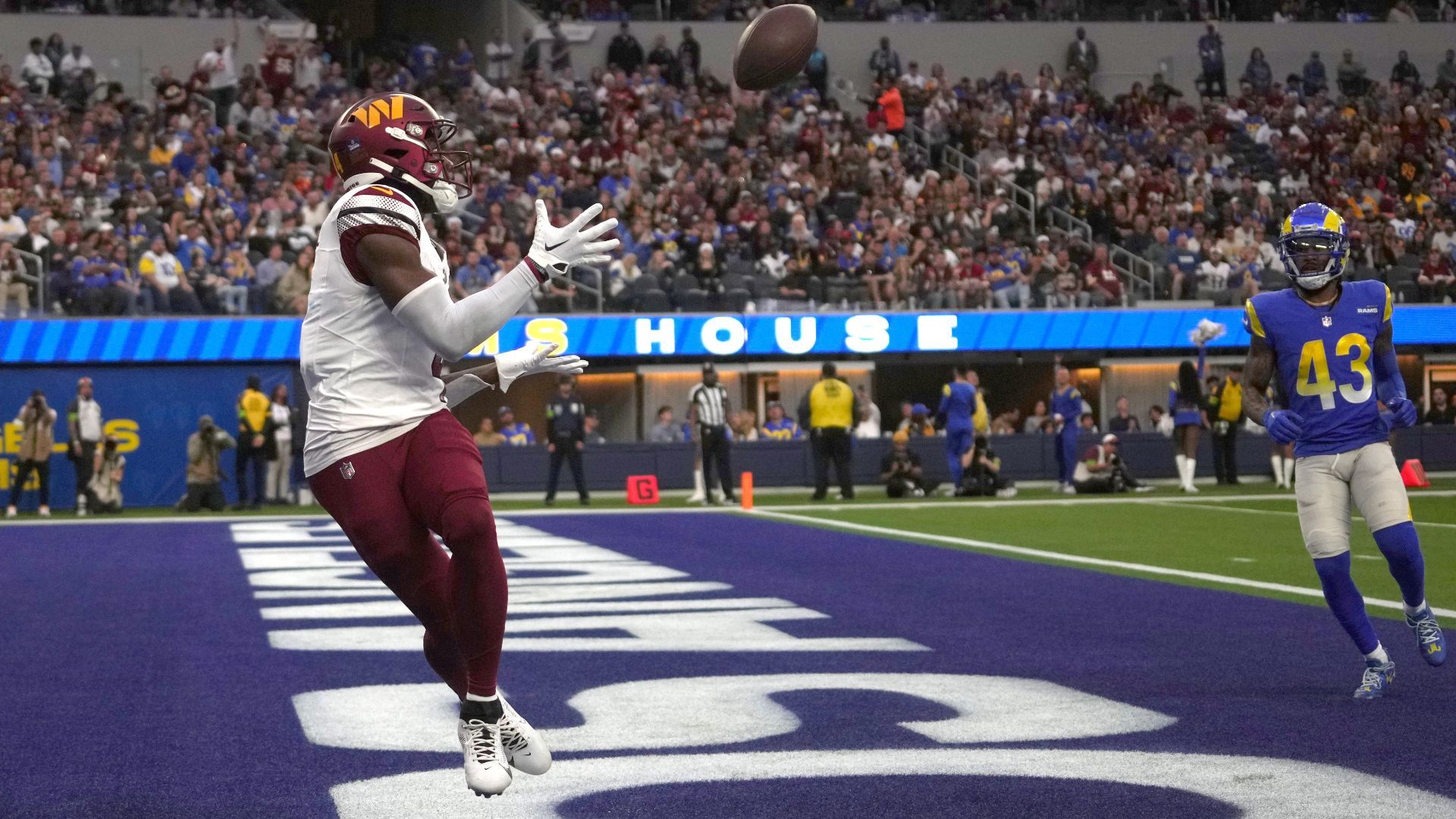 Dec 17, 2023; Inglewood, California, USA; Washington Commanders wide receiver Curtis Samuel (4) catches a touchdown pass in the second half against the Los Angeles Rams at SoFi Stadium. Mandatory Credit: Kirby Lee-USA TODAY Sports