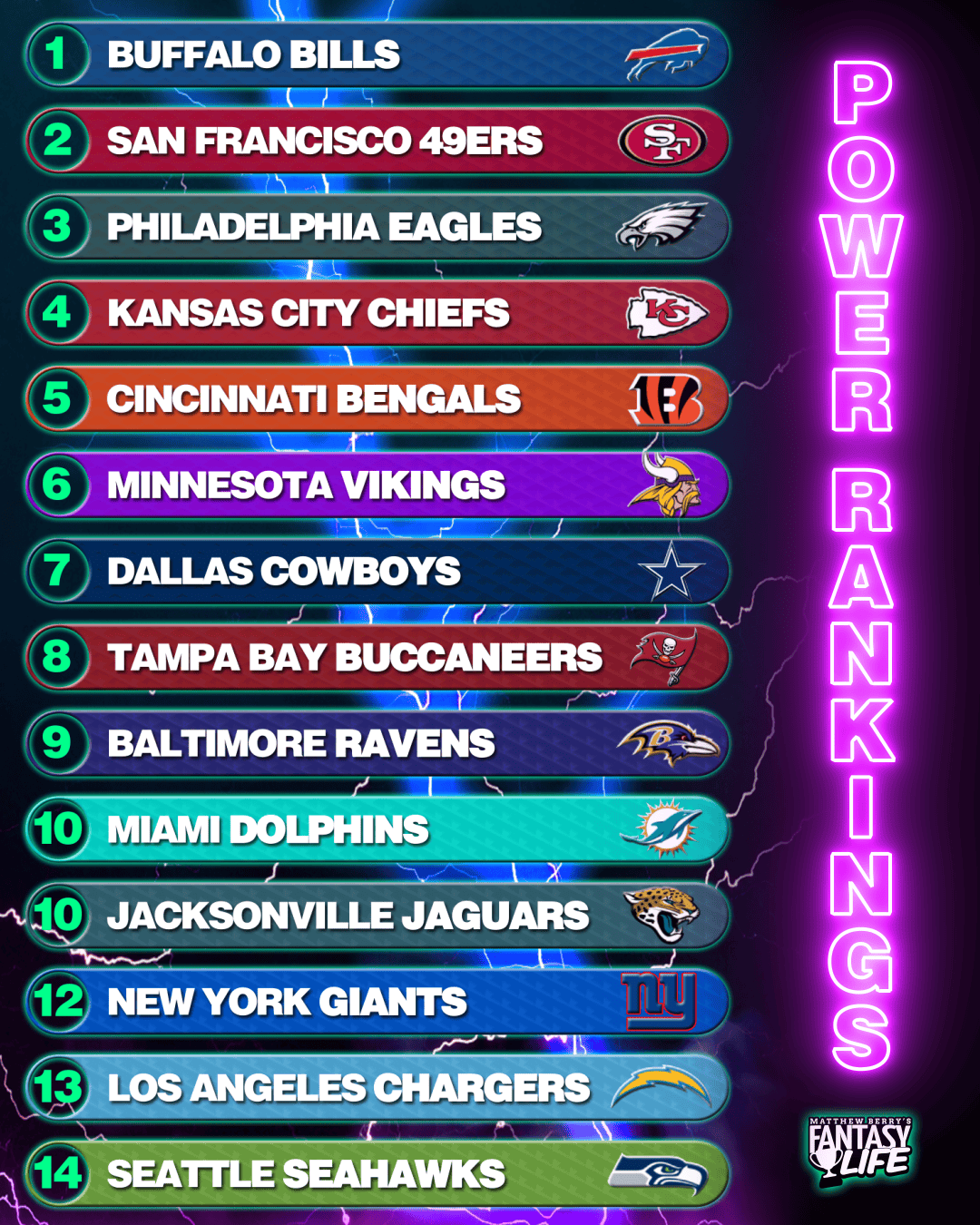 I took the number of times a team got an “adjusted win” (defeated a stronger opponent or won by two or more possessions) and divided it by their win total. As expected, the cream mostly rose to the top. Every team in the top eight power rankings had an adjusted win rate of over 60.0%. I’ll give Kansas City a pass because they’ve been playing with their food lately, and the Eagles just got Jalen Hurts back. But the Vikings can’t use either excuse.