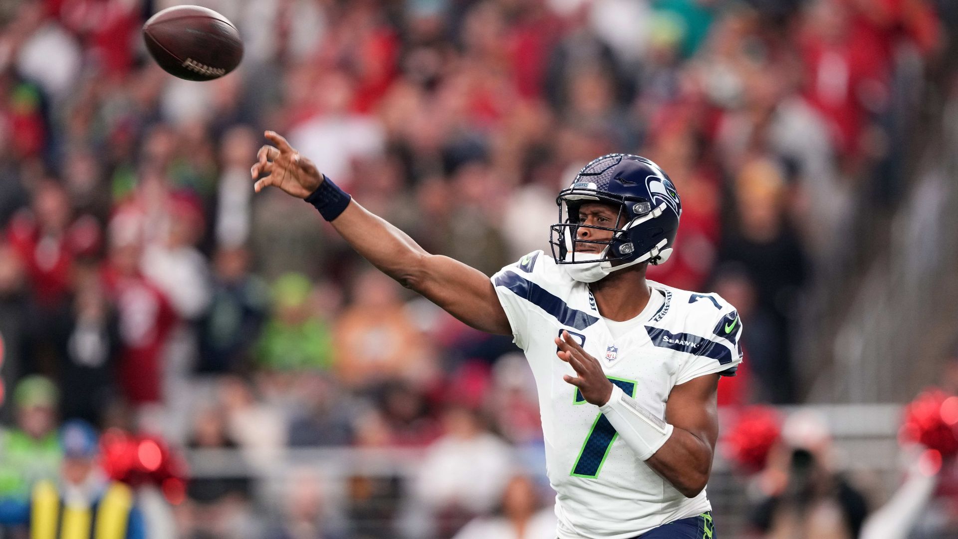 Jan 7, 2024; Glendale, Arizona, USA; Seattle Seahawks quarterback Geno Smith (7) throws a pass against the Arizona Cardinals during the first half at State Farm Stadium. Mandatory Credit: Joe Camporeale-USA TODAY Sports