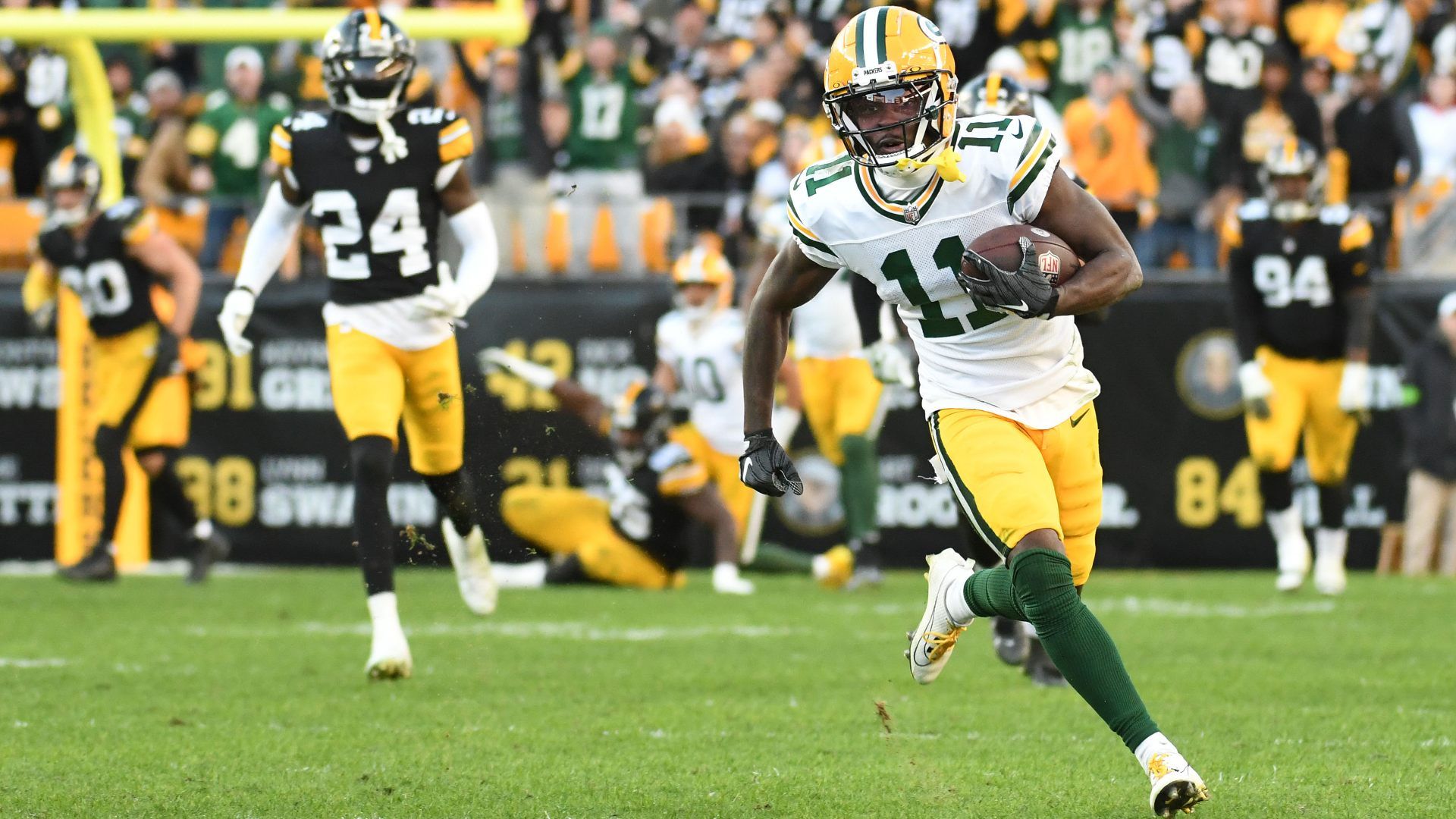 Nov 12, 2023; Pittsburgh, Pennsylvania, USA; Green Bay Packers wide receiver Jayden Reed (11) against the Pittsburgh Steelers during the fourth quarter at Acrisure Stadium. Mandatory Credit: Philip G. Pavely-USA TODAY Sports