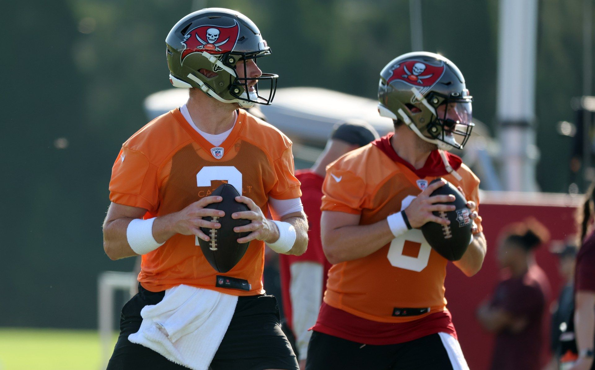 Jul 30, 2023; Tampa, FL, USA; Tampa Bay Buccaneers quarterback Kyle Trask (2) and Tampa Bay Buccaneers quarterback Baker Mayfield (6) work out during training camp at AdventHealth Training Center. Mandatory Credit: Kim Klement-USA TODAY Sports