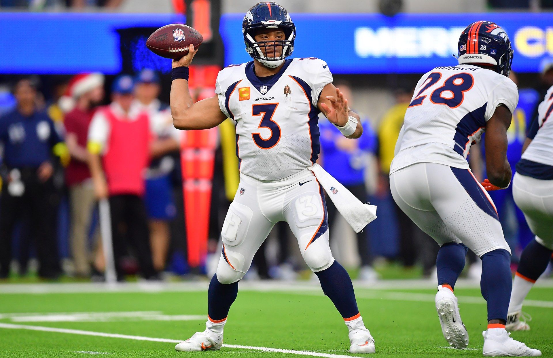 Dec 25, 2022; Inglewood, California, USA; Denver Broncos quarterback Russell Wilson (3) throws against the Los Angeles Rams during the second half at SoFi Stadium. Mandatory Credit: Gary A. Vasquez-USA TODAY Sports