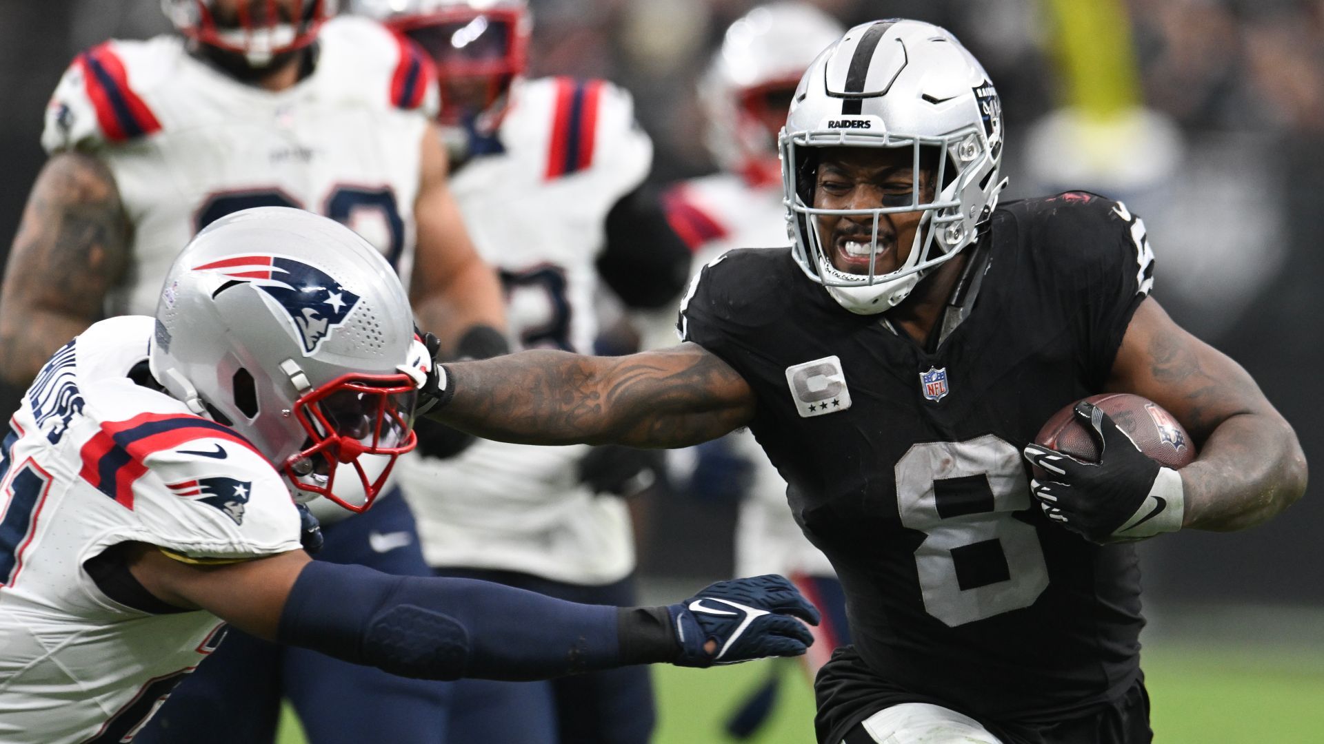 Oct 15, 2023; Paradise, Nevada, USA; Las Vegas Raiders running back Josh Jacobs (8) tries to avoid a tackle from New England Patriots safety Adrian Phillips (21) at Allegiant Stadium. Mandatory Credit: Candice Ward-USA TODAY Sports