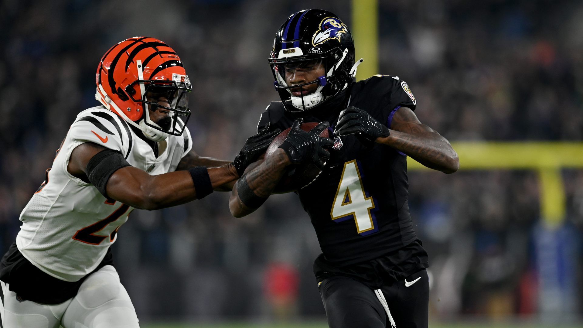 Nov 16, 2023; Baltimore, Maryland, USA; Baltimore Ravens wide receiver Zay Flowers (4) runs against Cincinnati Bengals safety Dax Hill (23) during the first quarter at M&T Bank Stadium. Mandatory Credit: Tommy Gilligan-USA TODAY Sports