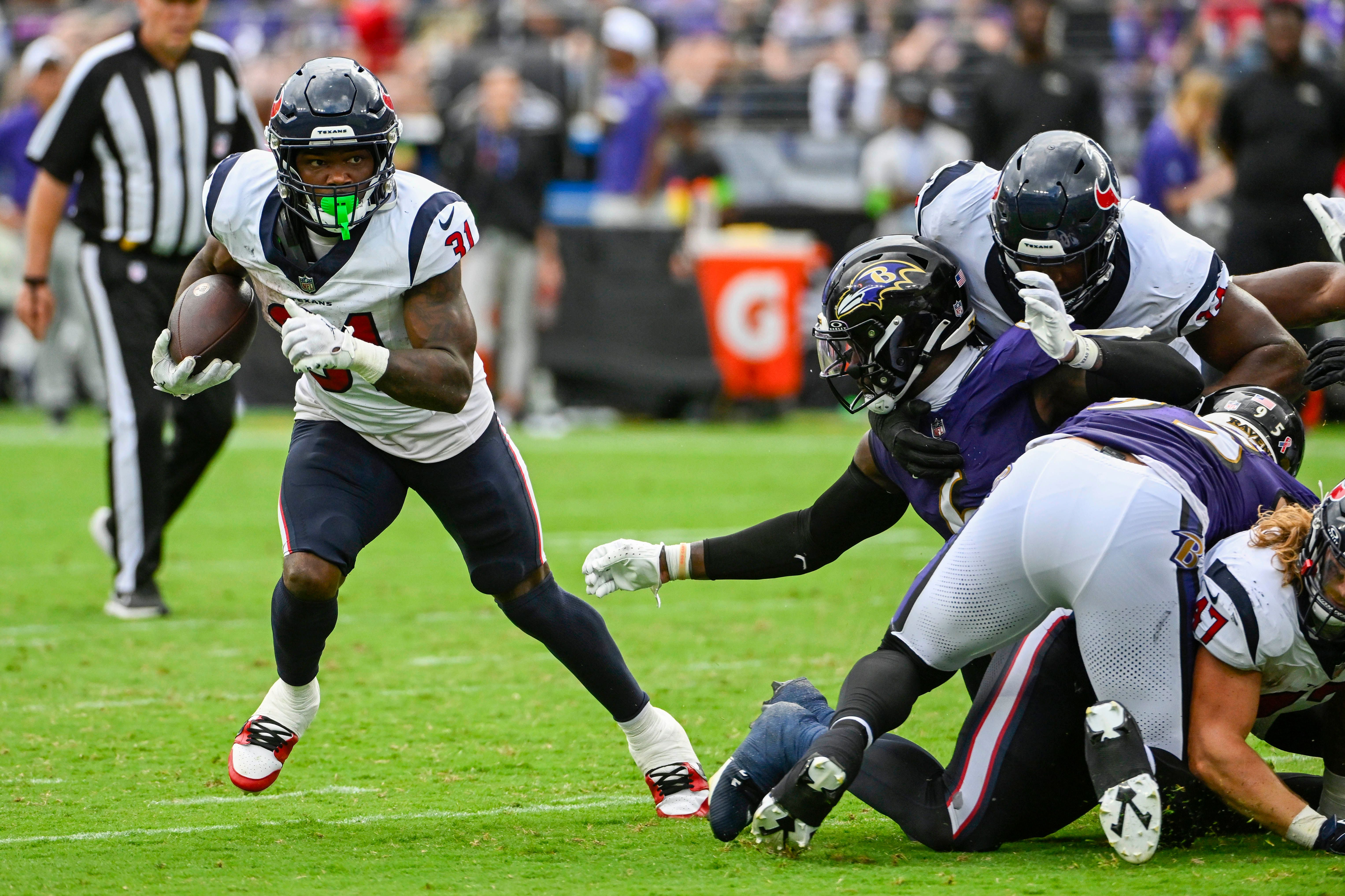 Sep 10, 2023; Baltimore, Maryland, USA; Houston Texans running back Dameon Pierce (31) carries the ball against the Baltimore Ravens during the second half at M&T Bank Stadium. Mandatory Credit: Brad Mills-USA TODAY Sports
