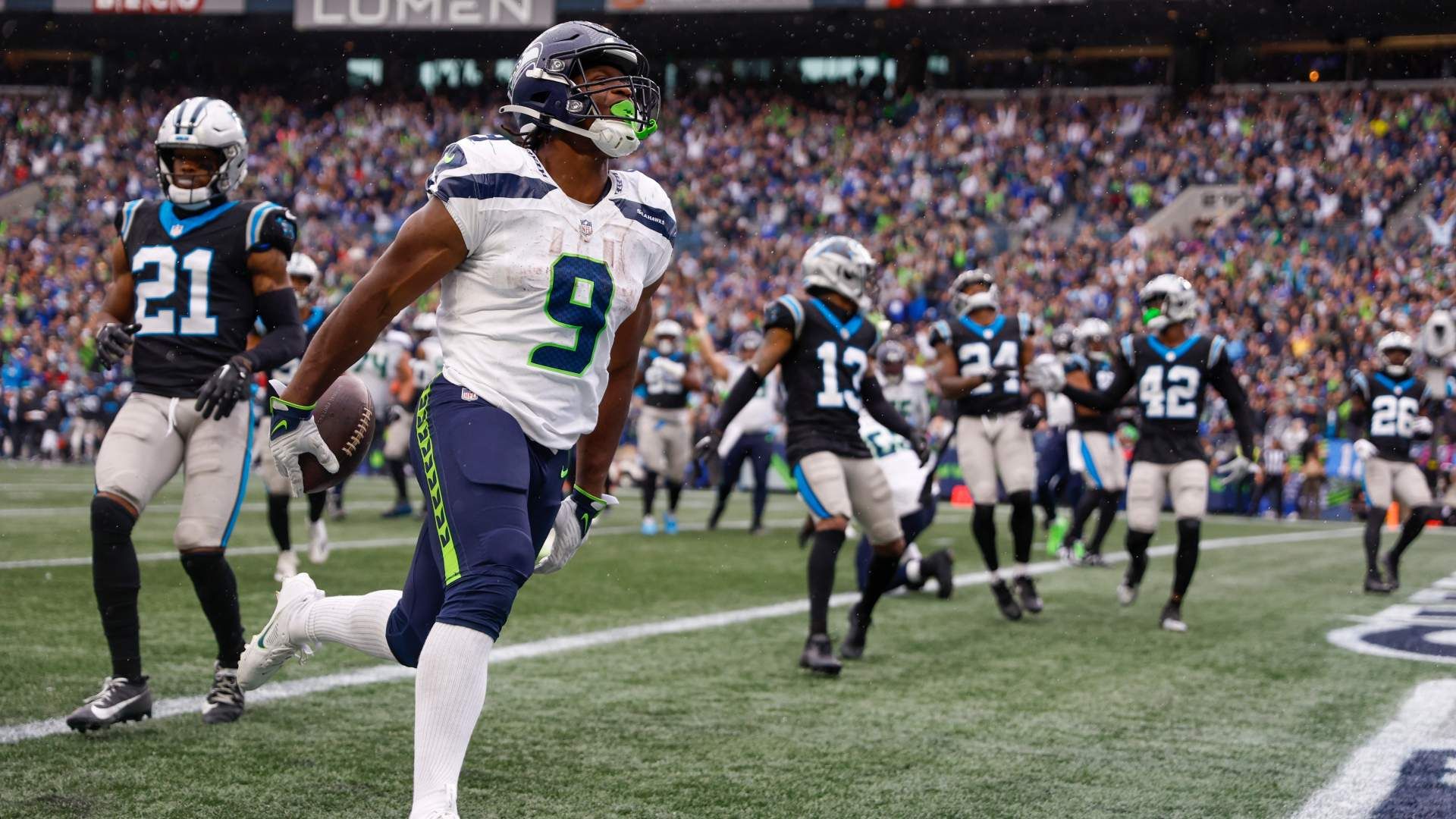 Sep 24, 2023; Seattle, Washington, USA; Seattle Seahawks running back Kenneth Walker III (9) celebrates after rushing for a touchdown against the Carolina Panthers during the fourth quarter at Lumen Field. Mandatory Credit: Joe Nicholson-USA TODAY Sports