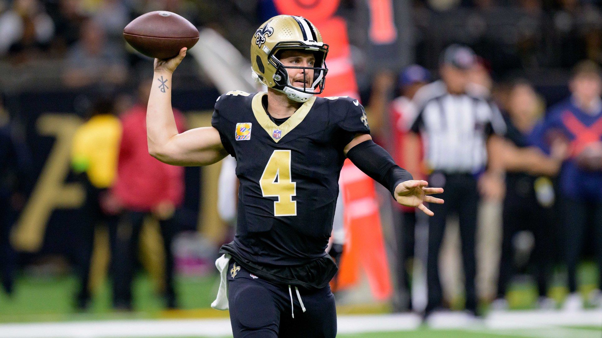 Oct 19, 2023; New Orleans, Louisiana, USA; New Orleans Saints quarterback Derek Carr (4) throws during the second quarter against the Jacksonville Jaguars at the Caesars Superdome. Mandatory Credit: Matthew Hinton-USA TODAY Sports