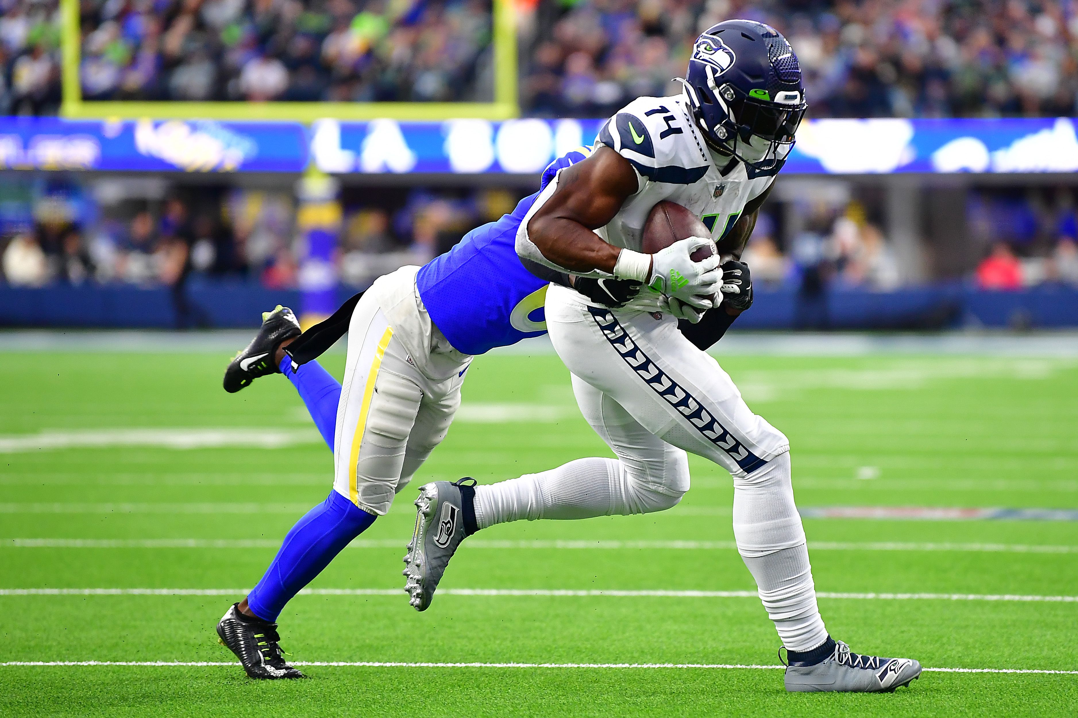 Dec 4, 2022; Inglewood, California, USA; Seattle Seahawks wide receiver DK Metcalf (14) runs the ball against Los Angeles Rams cornerback Derion Kendrick (6) during the second half at SoFi Stadium. Mandatory Credit: Gary A. Vasquez-USA TODAY Sports