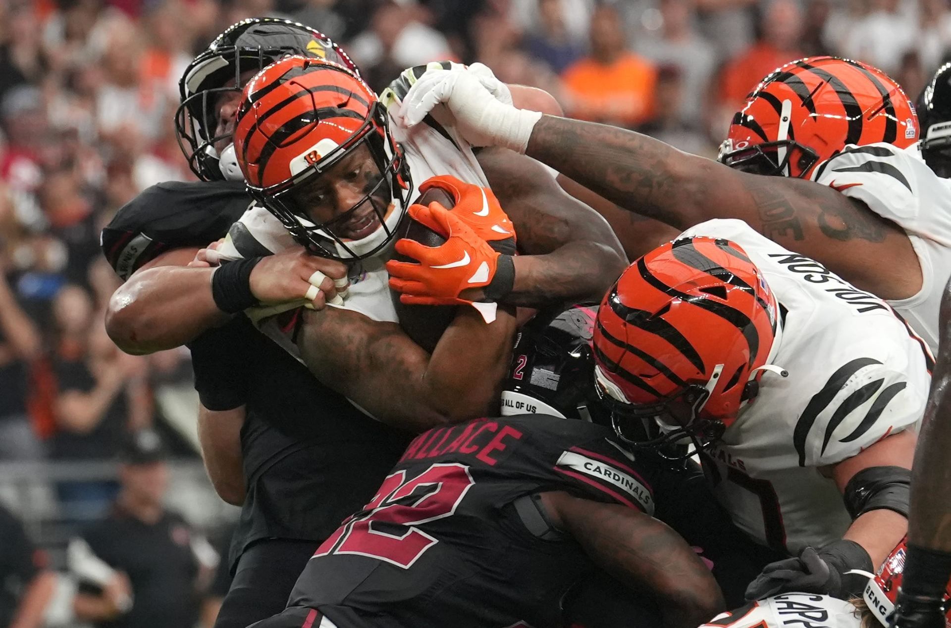 Cincinnati Bengals running back Joe Mixon (28) is stopped at the goal line by the Arizona Cardinals at State Farm Stadium in Glendale on Oct. 8, 2023.