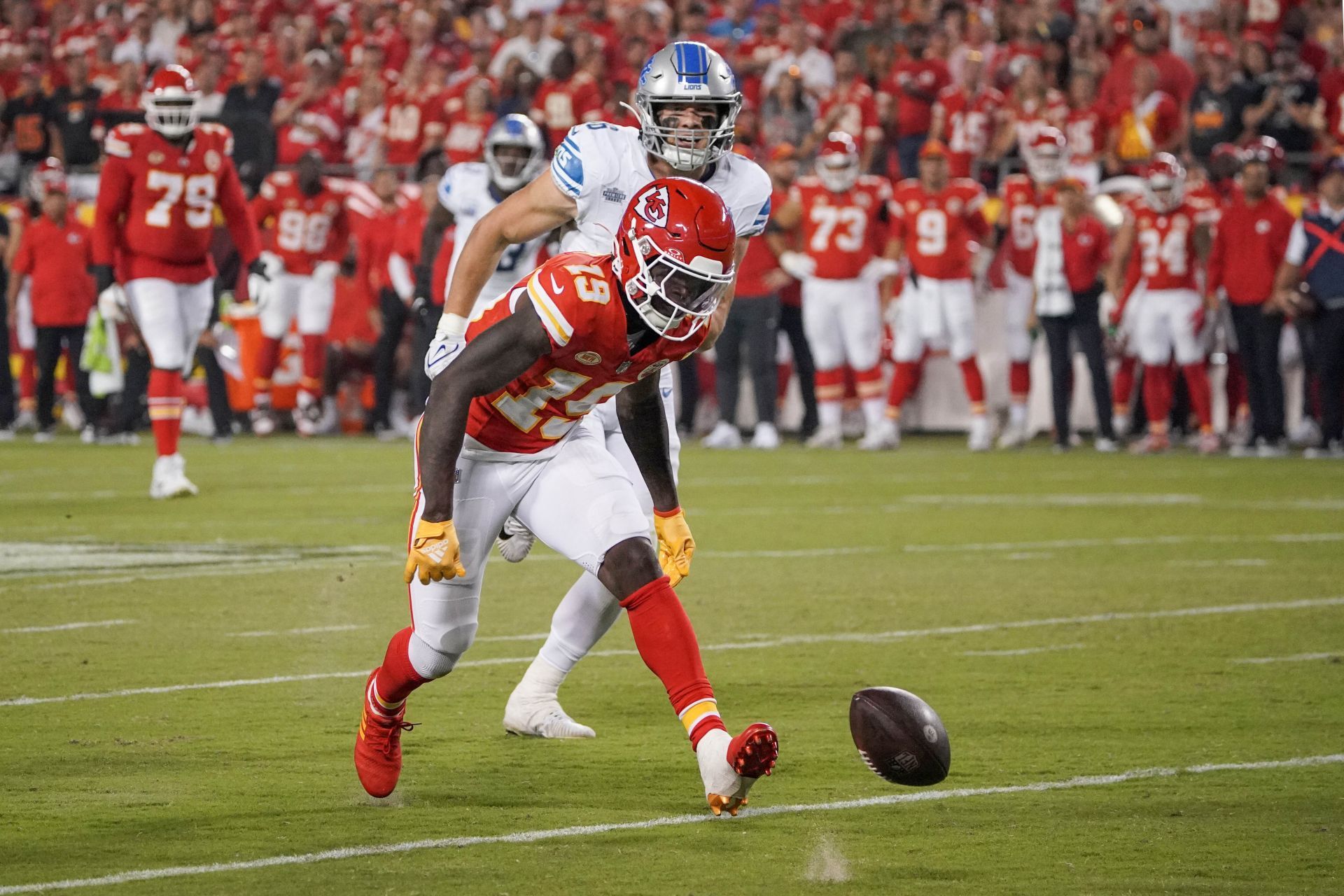 Sep 7, 2023; Kansas City, Missouri, USA; Kansas City Chiefs wide receiver Kadarius Toney (19) drops a pass as Detroit Lions linebacker Jack Campbell (46) looks on during the second half at GEHA Field at Arrowhead Stadium. Mandatory Credit: Denny Medley-USA TODAY Sports