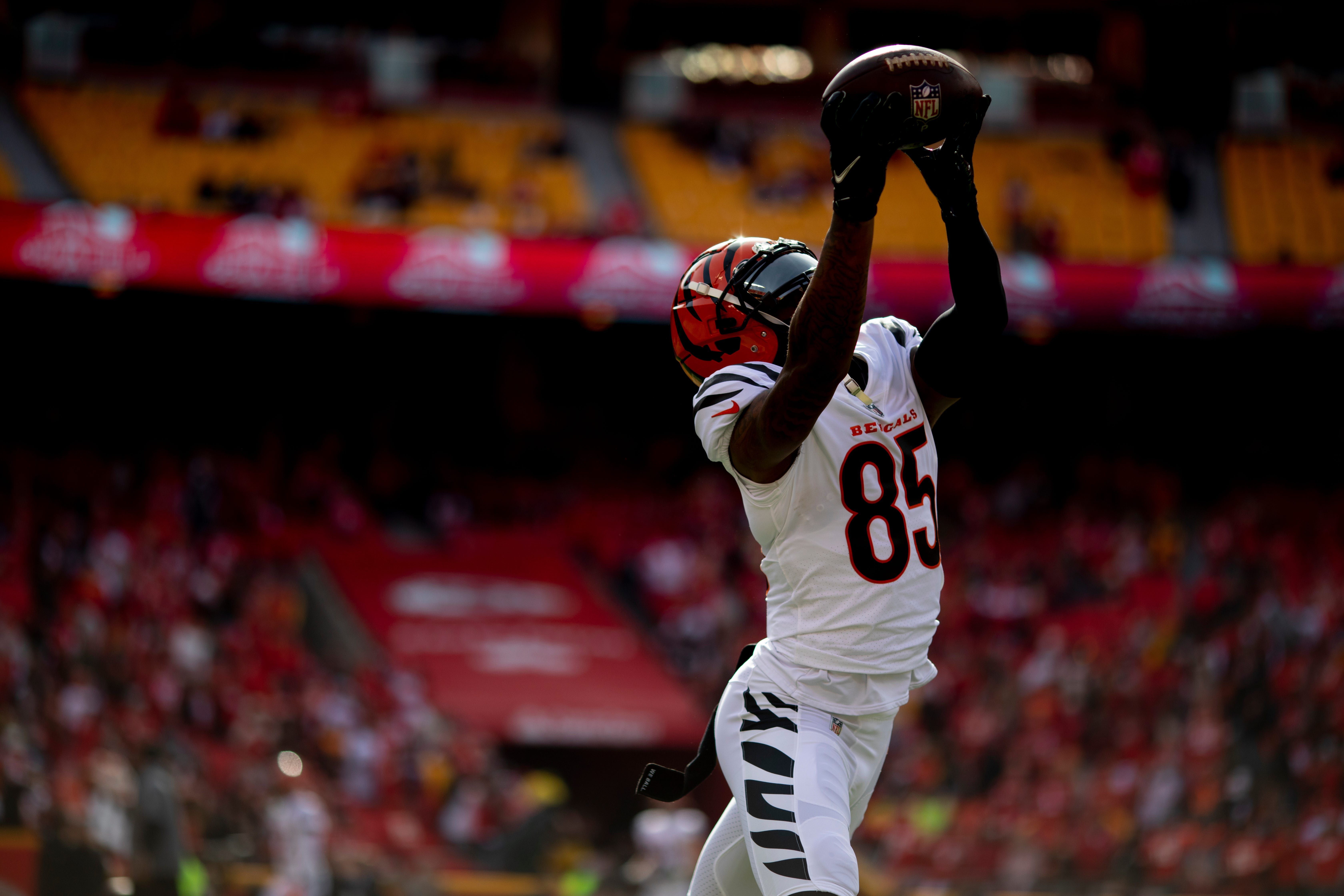 Cincinnati Bengals wide receiver Tee Higgins (85) catches a pass while warming up before the AFC championship NFL football game, Sunday, Jan. 30, 2022, at GEHA Field at Arrowhead Stadium in Kansas City, Mo. Cincinnati Bengals At Kansas City Chiefs Jan 30 Afc Championship 20