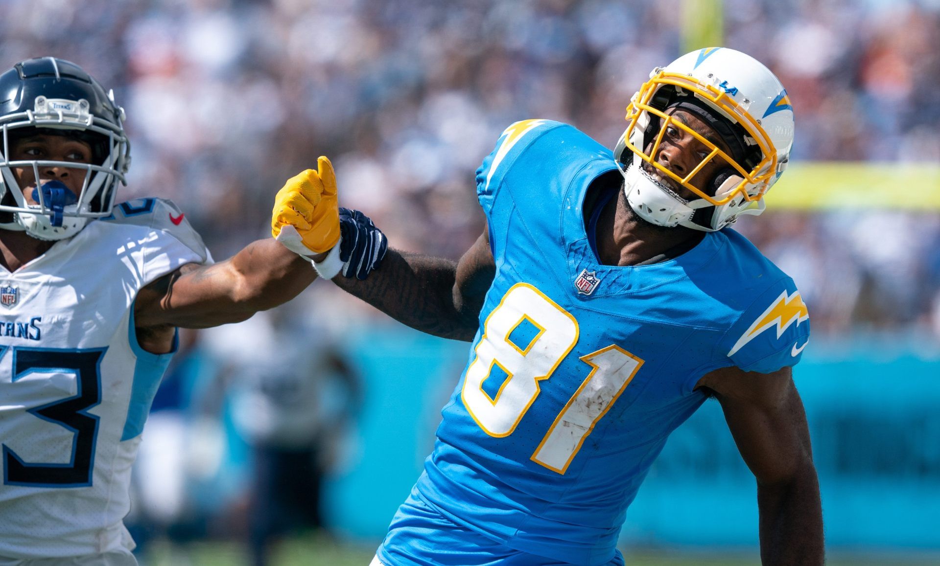 Los Angeles Chargers wide receiver Mike Williams (81) can't catch up to an overthrown pass while defended by Tennessee Titans cornerback Tre Avery (23) during their NFL game at Nissan Stadium Sunday afternoon, Sept. 17, 2023.