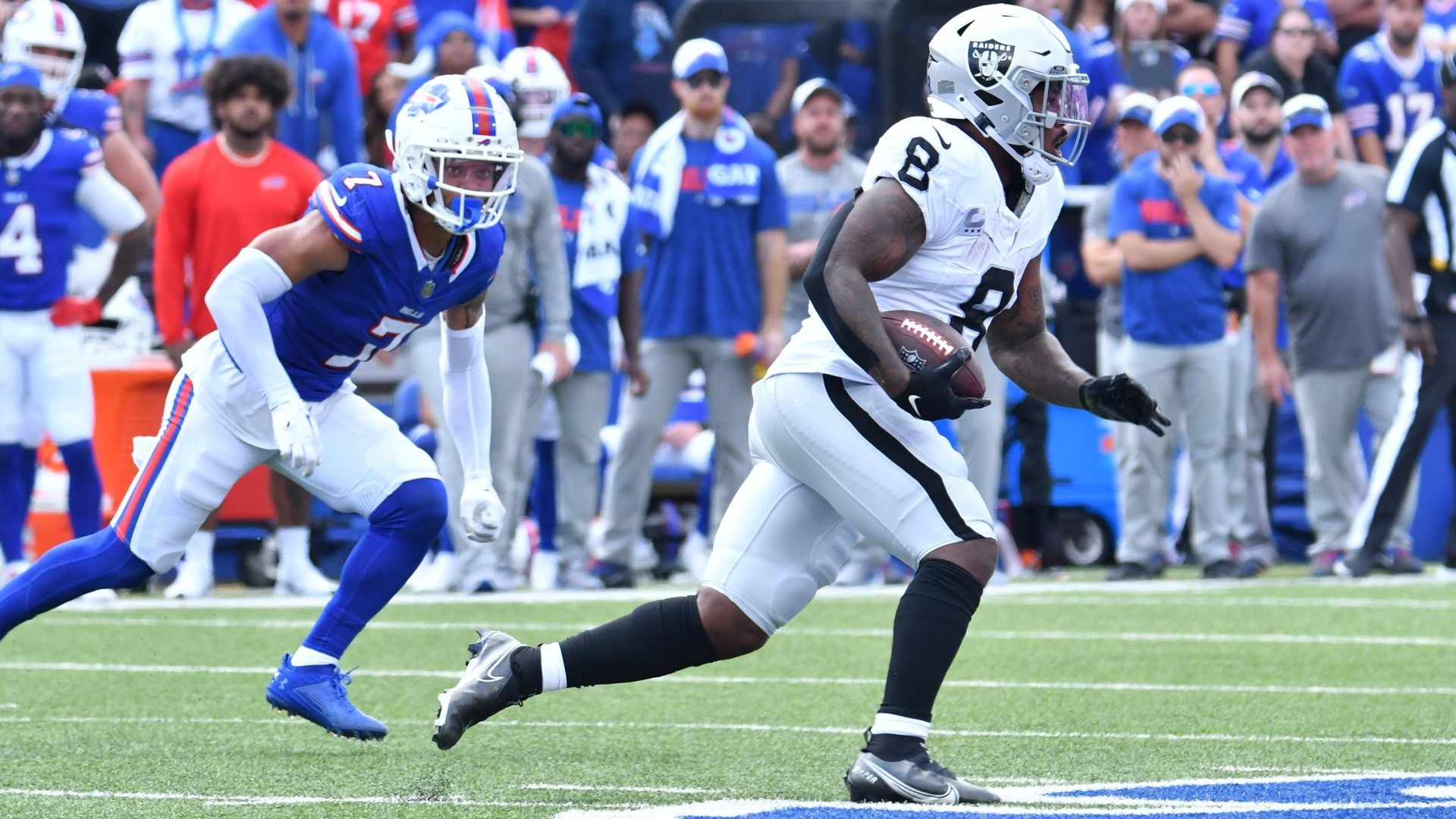 Sep 17, 2023; Orchard Park, New York, USA; Las Vegas Raiders running back Josh Jacobs (8) gets past Buffalo Bills cornerback Taron Johnson (7) on a run in the second quarter at Highmark Stadium. Mandatory Credit: Mark Konezny-USA TODAY Sports